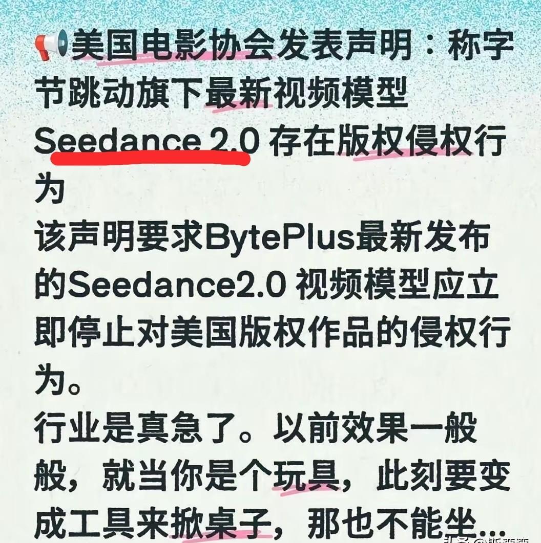 春节档还没开打,好莱坞先被一条国产AI吓得连夜写60页告状信! 字节Seedance2.0刚内测,MPA就跳出来喊“侵权”,笑死人——刀没砍下来,血条先空了? 说白了,这软件就是“拍片外挂”:输入一句话,镜头脚本分镜自动给你拉满。 以前拍短片得求爷爷告奶奶找摄像租器材,现在? 手机+Seedance,5分钟出片,质感还吊打某些S+古偶。 好莱坞能不慌吗? 再慢半步,横店群演都能剪出《复联5》! 更骚的是,MPA告的不是AI,是“你们老百姓别乱用”。 翻译一下:技术我拦不住,先给你扣个“盗版原罪”帽子,吓退一群胆小鬼。 ——这套路熟不熟? 当年他们也是这样喷录像带、MP3、BT种子,结果哪次不是真香? 说到底,谁掌握“一键拍大片”的按钮,谁就掌握下一代票房。 好莱坞百年霸权,最怕的就是“内容不再稀缺”。 以前拍部电影要烧上亿,现在AI把成本打到骨折,故事好听就行,明星片酬? 抱歉,算法脸随便换。 放心,Seedance不会干掉电影,只会干掉混子。 那些靠IP洗钱、靠流量抬轿的烂片,才该真正发抖。 你站谁? A国产AI给普通人发摄像机,B好莱坞死守“高价俱乐部”? 评论区扣1 or 2,我看看多少人想自己当导演!