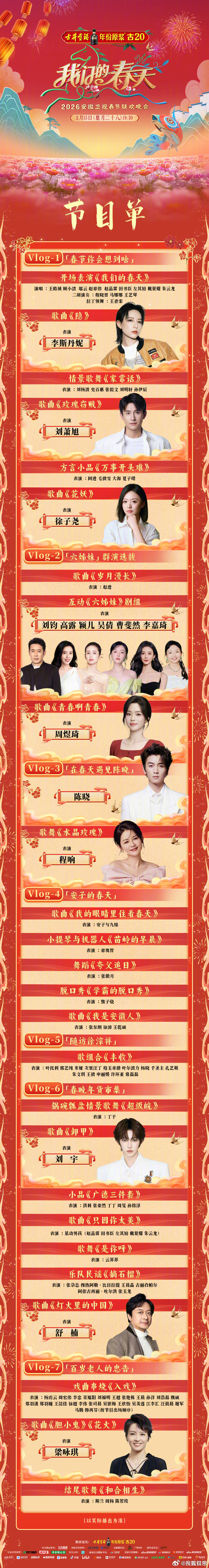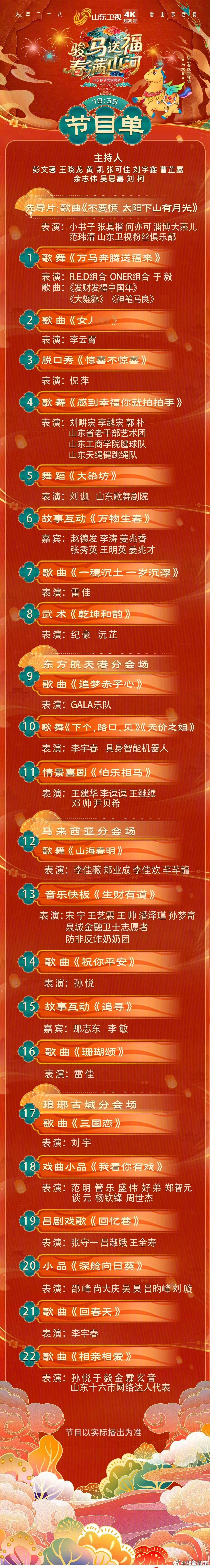 19:30 辽宁卫视春晚:周深、汪苏泷、于适等19:30 川渝春晚:GAI、刘宇、TF家族四代、蒋易、孙天宇、谭维维、房东的猫等19:30 广东卫视春晚:陈楚生、曾舜晞、西城男孩、张呈、王男、王广等19:30 安徽卫视春晚:陈晓、刘宇、刘萧旭、李斯丹妮等19:35 山东卫视春晚:李宇春、李云霄、孙悦、刘宇等