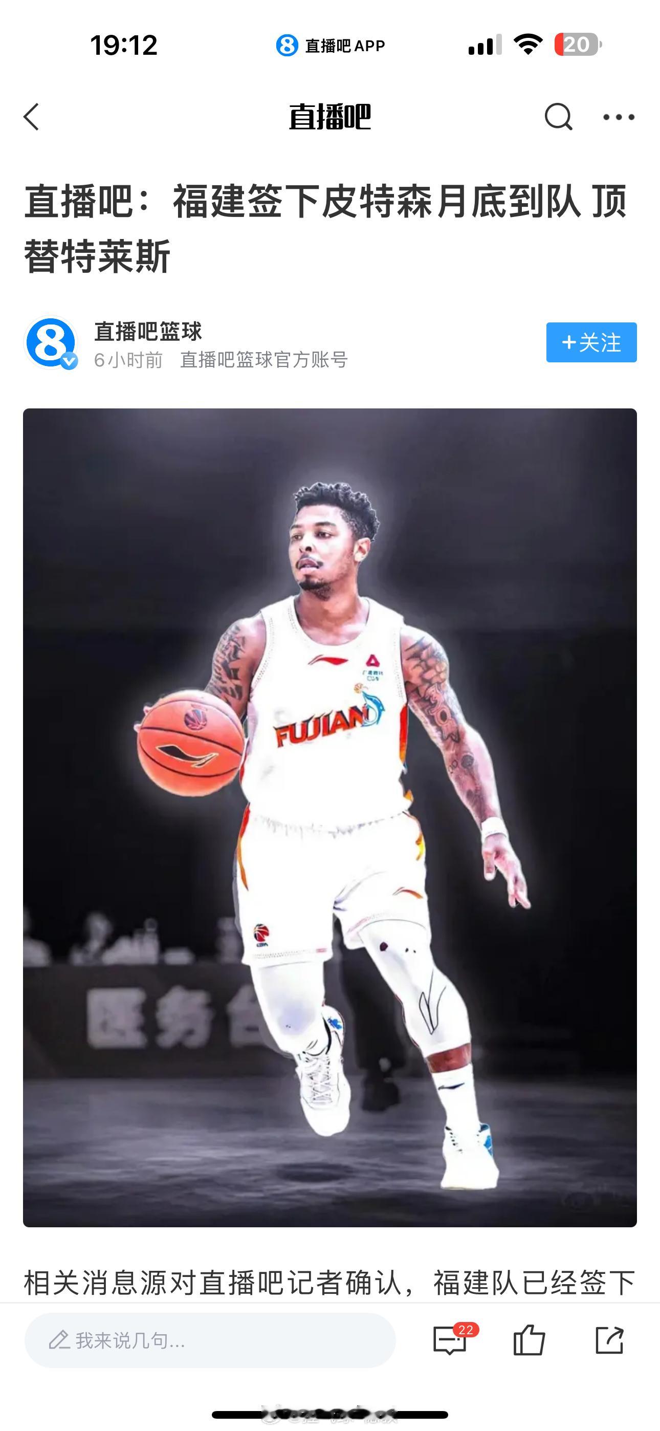 皮特森在个人社交媒体也转发了加盟福建队的消息福建男篮
