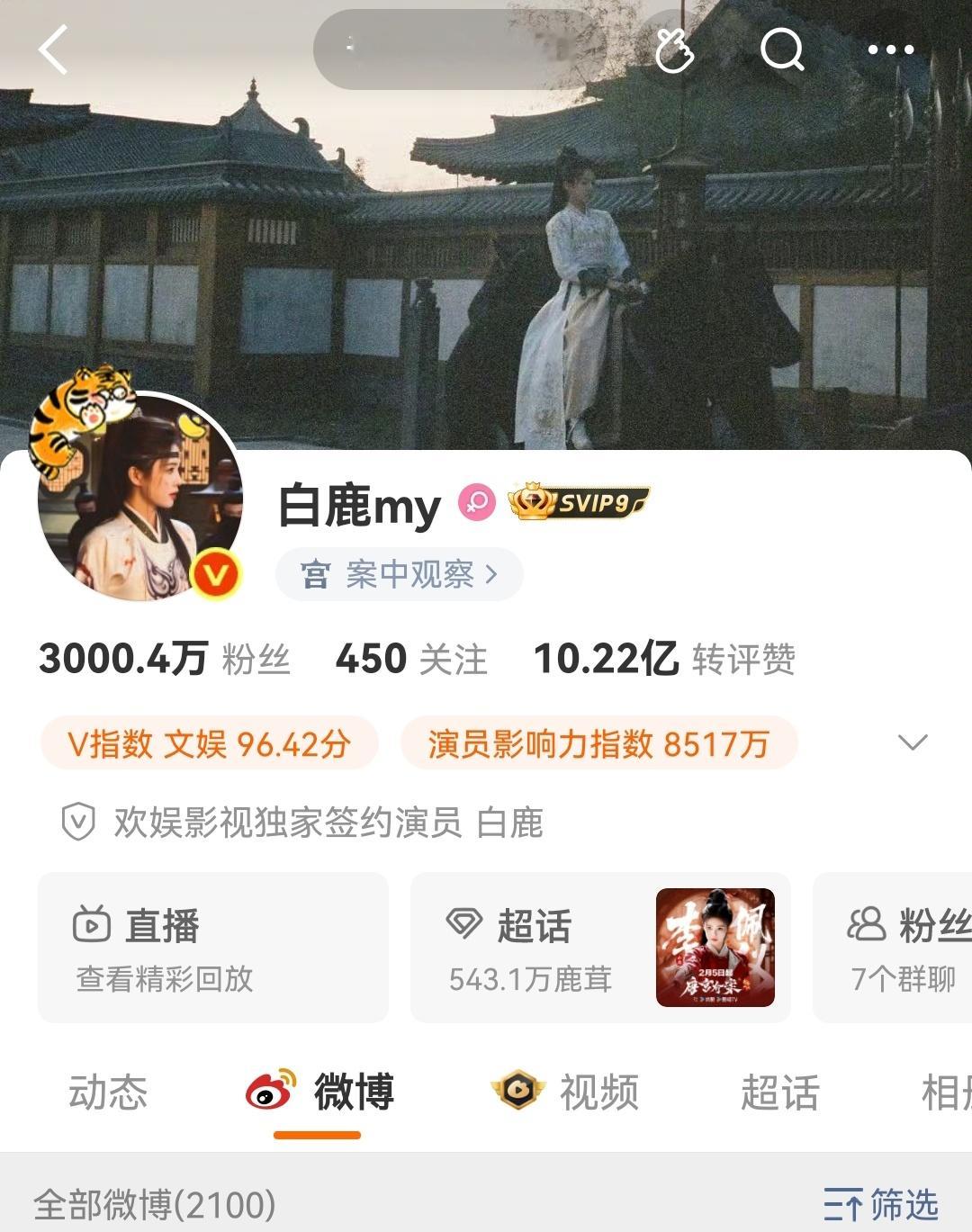恭喜白鹿微博粉丝突破3000万!唐宫奇案有效播剧!
