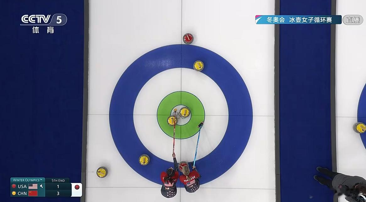 把美国队愁的哈哈哈。老妹和老韩静静看戏~“one yellow(东北版)” 偷1分,上半场4-1领先美国队。冬奥会冰壶