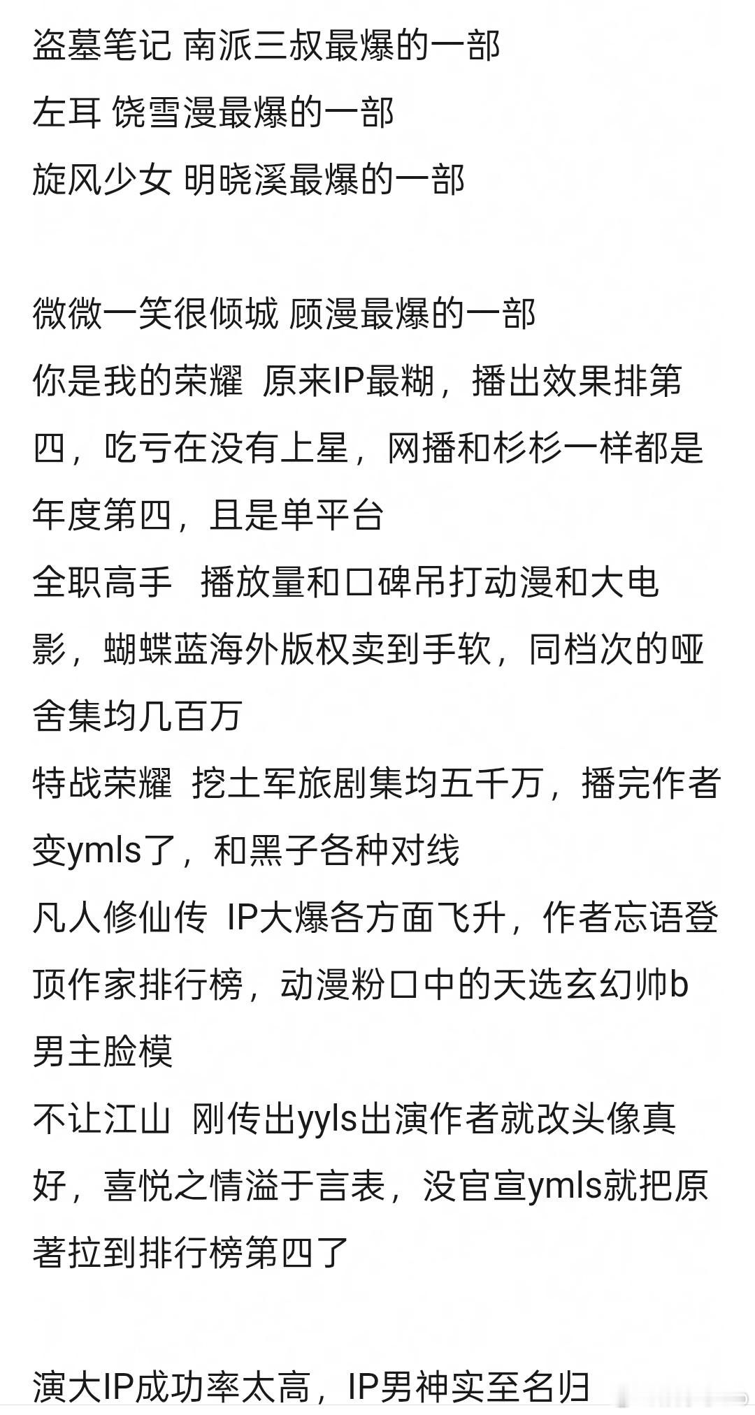 杨洋的IP影视化战绩太厉害了,怪不得被称为IP镀金师盗墓笔记 南派三叔最爆的一部 左耳 饶雪漫最爆的一部 旋风少女 明晓溪最爆的一部 微微一笑很倾城 顾漫最爆的一部