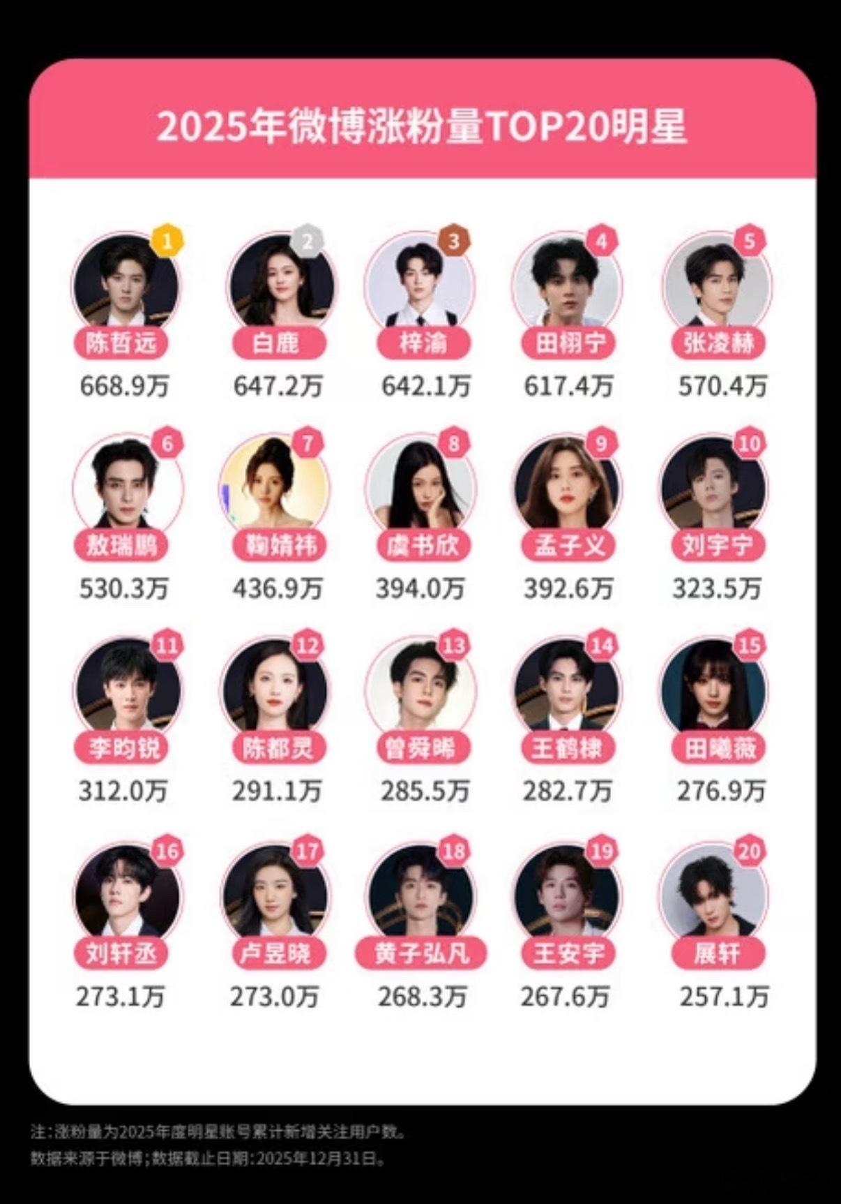陈哲远 散财童子白鹿 红包金额陈哲远今年出席又要大15万红包,白鹿第二名也有10万。去年陈哲远靠着发红包涨了几百万粉丝,成为25年微博涨粉最多的明星,这种涨粉方式性价比很高啊屡试不爽了