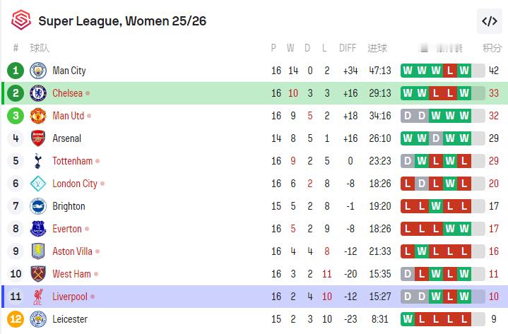 利物浦女足上半场守了40分钟还是丢球了,不过昨天莱斯特0-6负于曼城继续垫底
