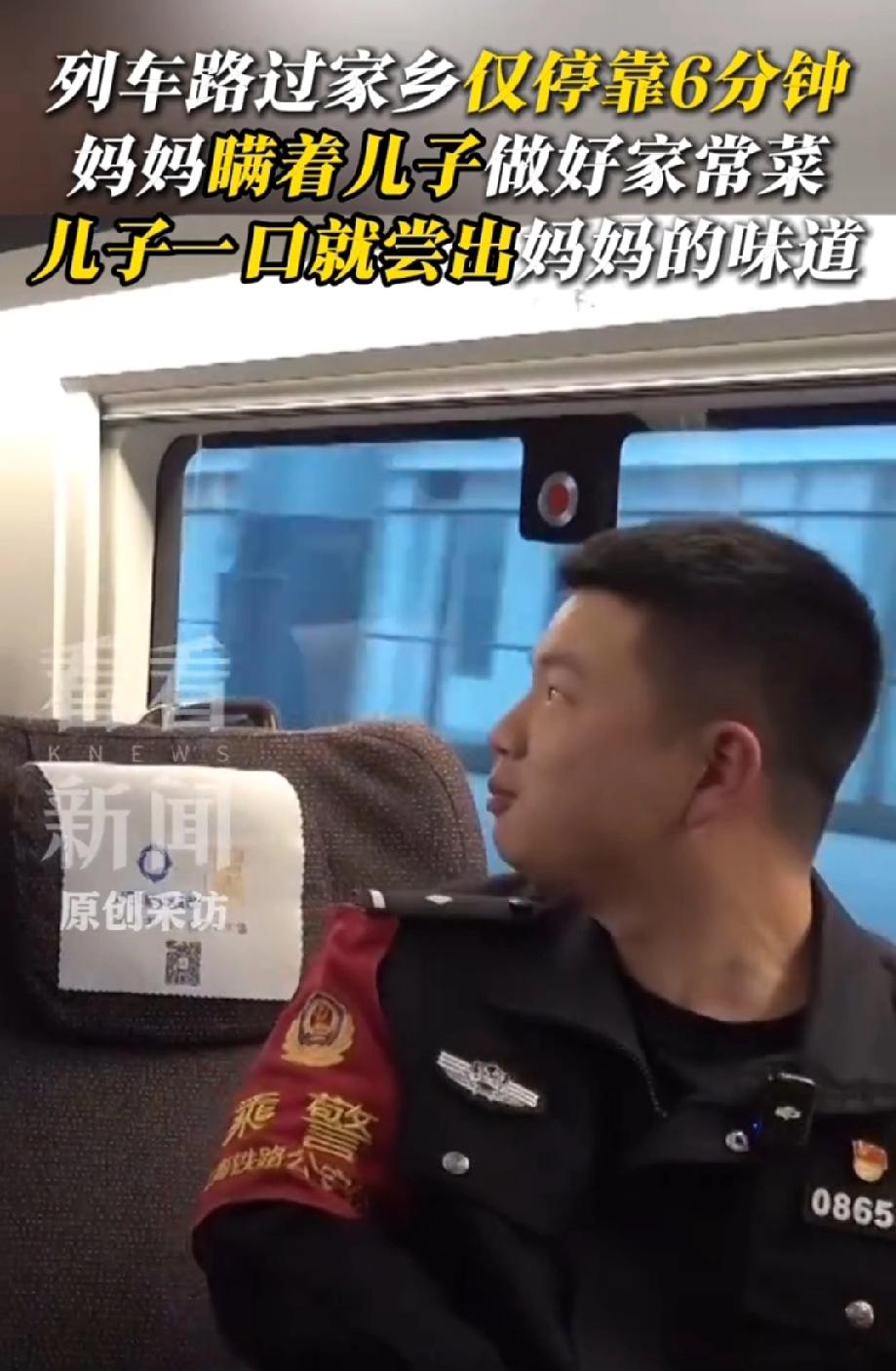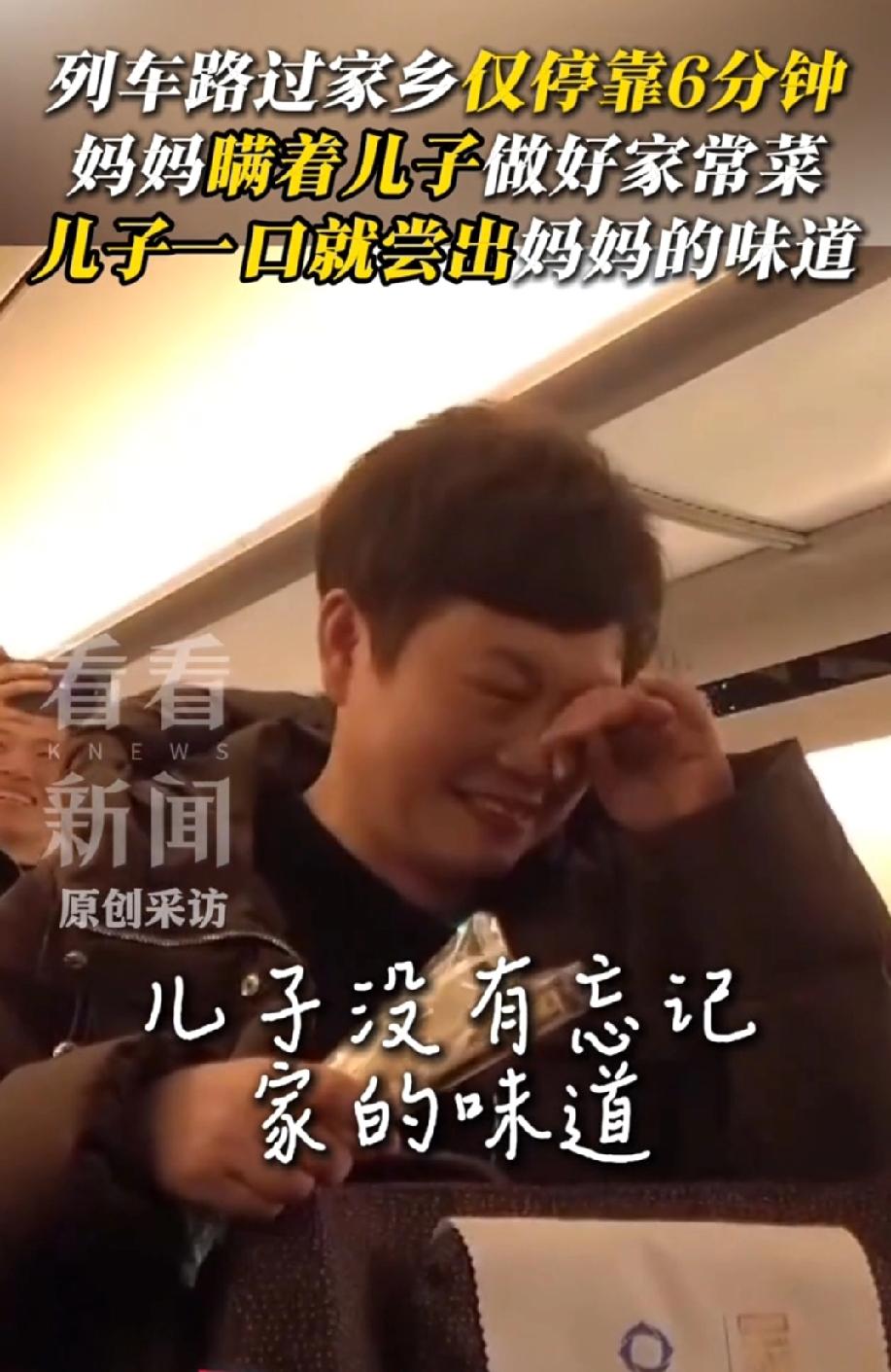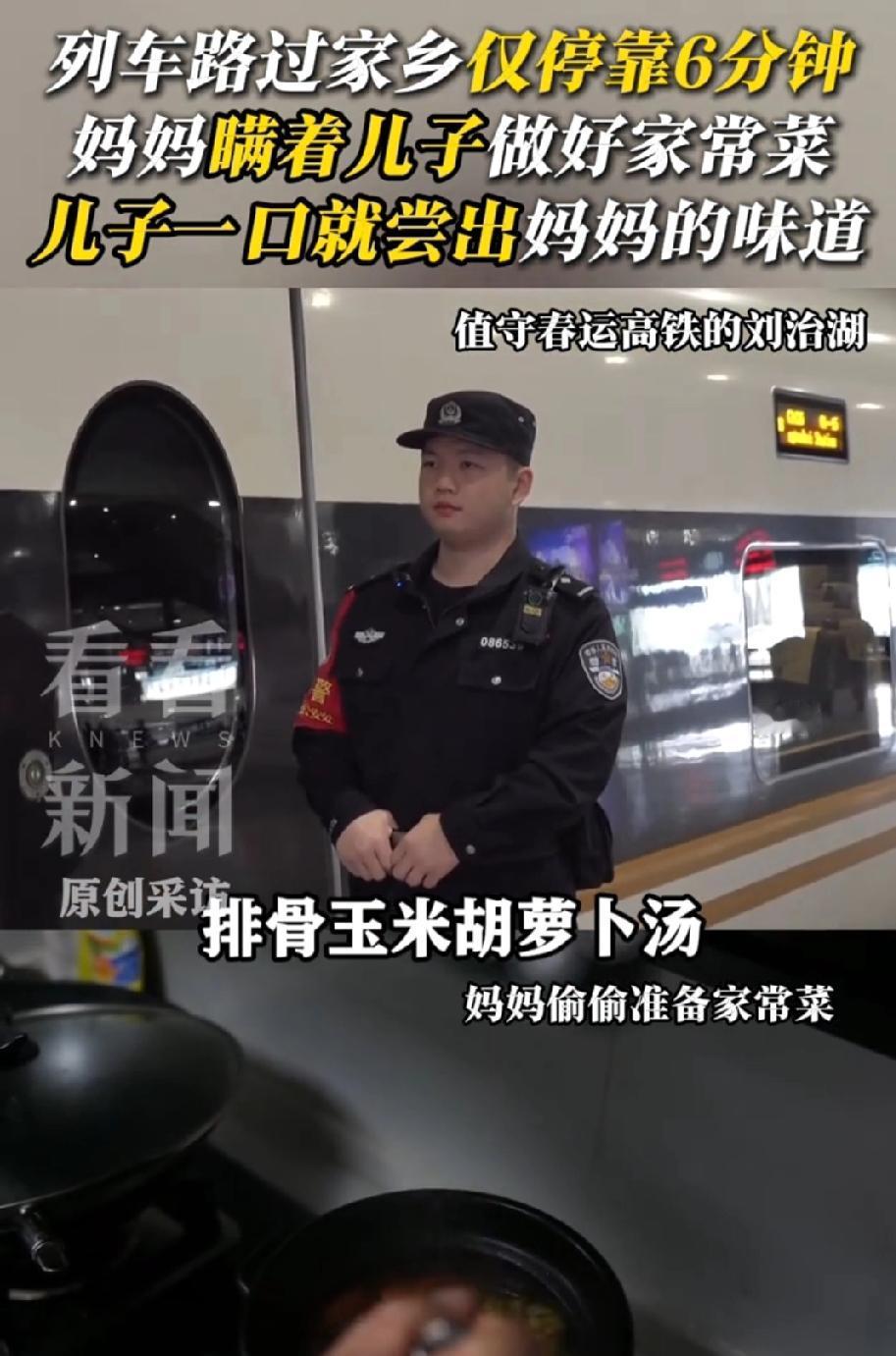 要是有一天,有人给你送去妈妈做的饭菜,你能吃出来吗? 有一个小哥哥要值守春运高铁,他值守的高铁家乡站的时候只停留6分钟。 小哥哥的妈妈买菜,煲好烫,在列车停靠的时候和小哥哥的双胞胎哥哥偷偷上了这一列高铁。 小哥哥吃这些菜的时候一边吃一边说,这个菜很有家的味道。 “喝点汤吧”。正在吃饭的小哥哥听到了哥哥的声音,转头发现,后面站着妈妈和哥哥。