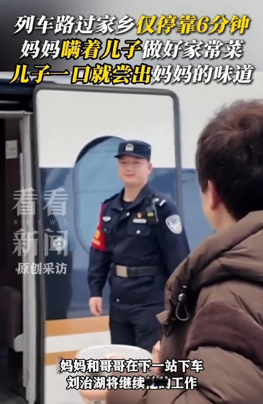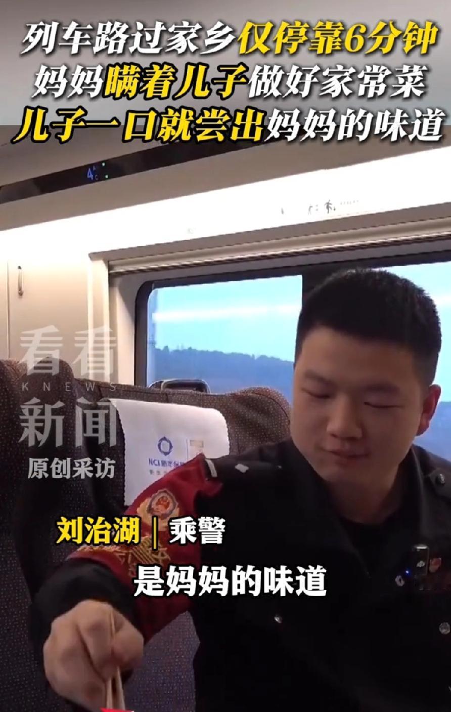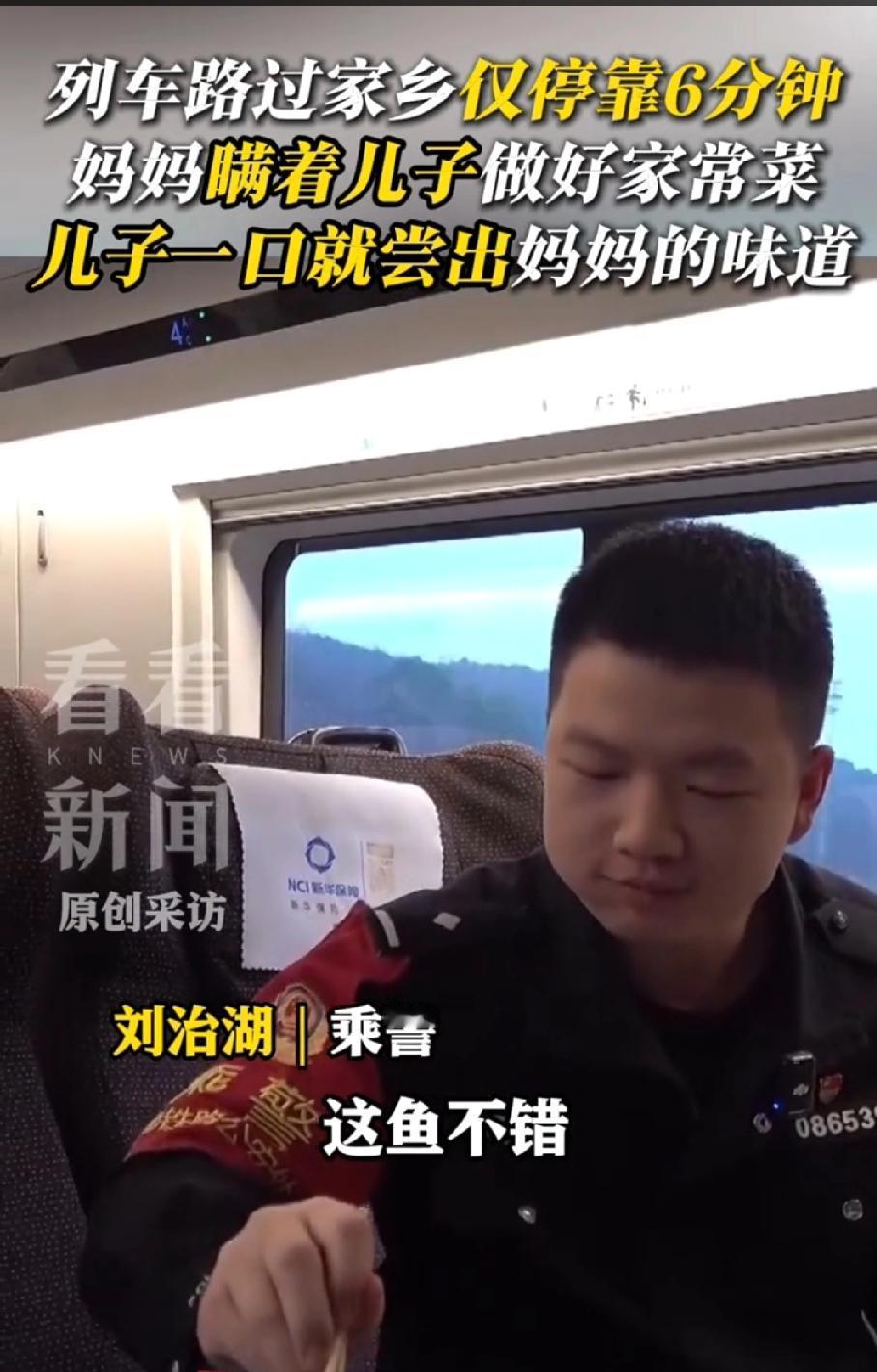 要是有一天,有人给你送去妈妈做的饭菜,你能吃出来吗? 有一个小哥哥要值守春运高铁,他值守的高铁家乡站的时候只停留6分钟。 小哥哥的妈妈买菜,煲好烫,在列车停靠的时候和小哥哥的双胞胎哥哥偷偷上了这一列高铁。 小哥哥吃这些菜的时候一边吃一边说,这个菜很有家的味道。 “喝点汤吧”。正在吃饭的小哥哥听到了哥哥的声音,转头发现,后面站着妈妈和哥哥。