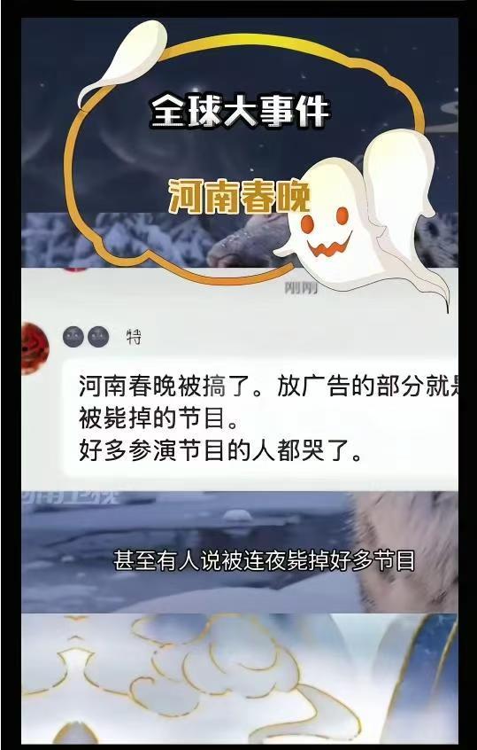 河南电视台太依赖绿幕,舞蹈编排很不错,但是视觉整体效果不明亮,观感不好。 昨天老爹几次三番的推荐我看春晚,不得已敷衍他几句,喵了一眼就关了。 这就是当时对鞑清太宽容导致,宽容,是感化不了那些骨子里坏的东西! 看一小会儿,换台了,合成的太多,有失真实,还不如看以前的老电影,老电视剧。 其实前几年出圈也是因为比较早利用了现代声光电和AI技术,在还不普及的时候唬了大家一下。 节目质量没问题,就行,你还要啥自行车?办好节目就需大量投入,你以为是班级元旦晚会呢?没广告哪来资金办春晚?