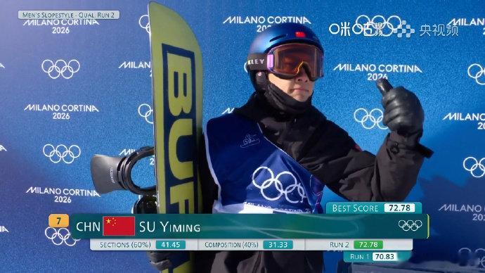 苏翊鸣第二滑72.78分,在目前的成绩中,已经锁定决赛晋级名额。