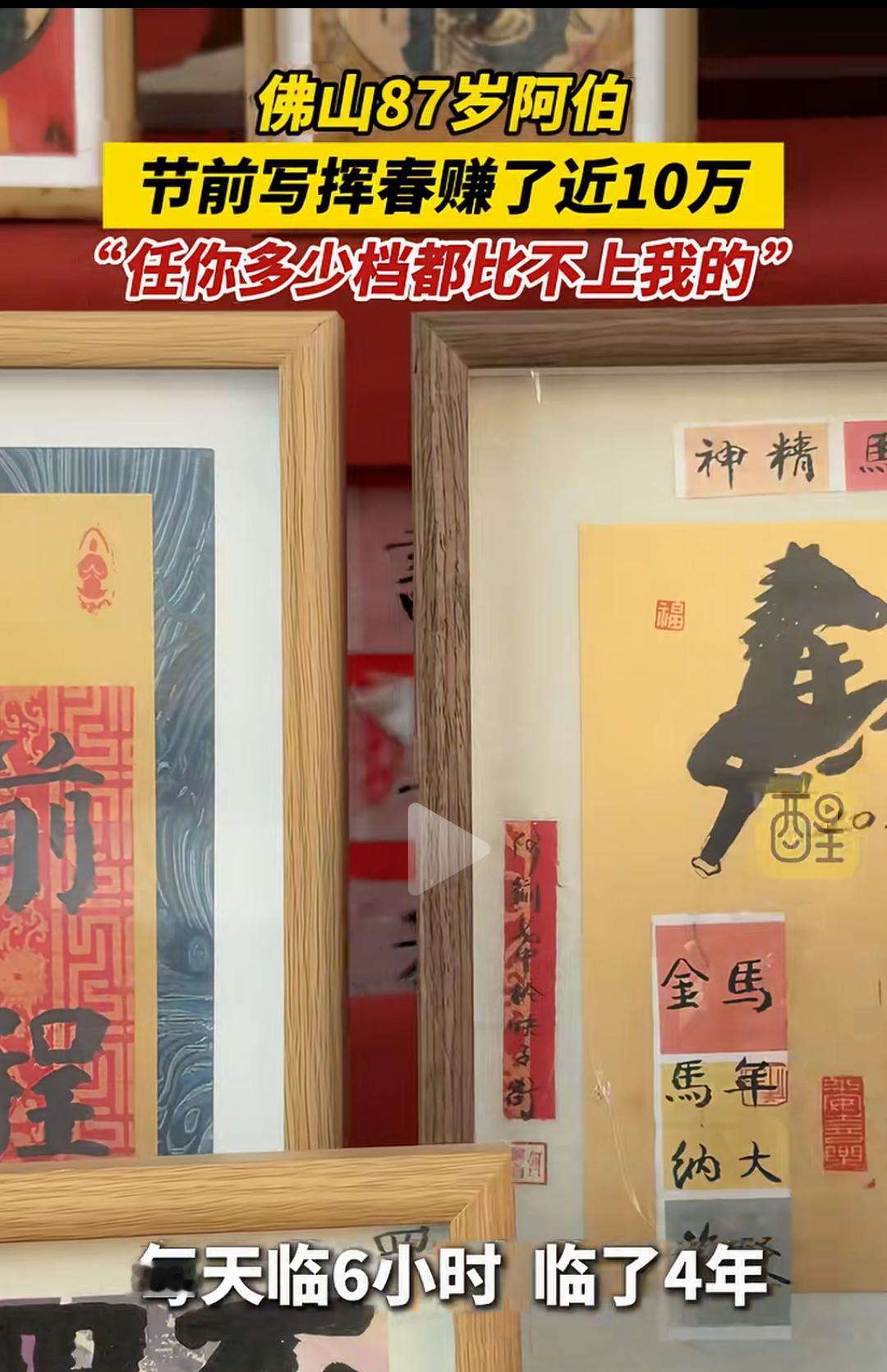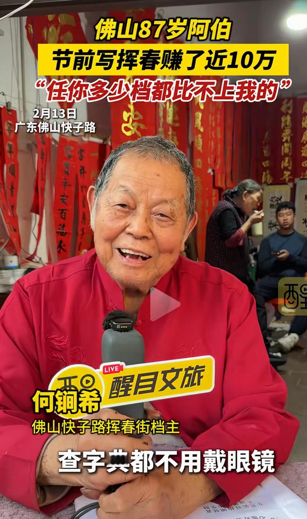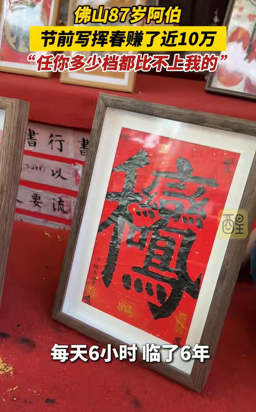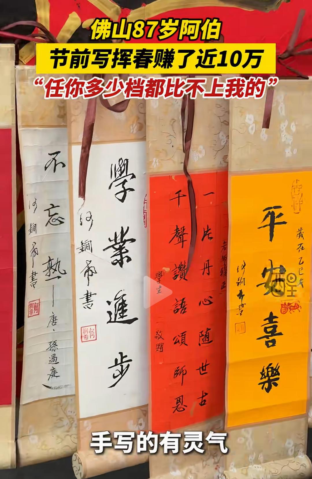 佛山87岁阿伯节前写挥春赚了近10万,自信“任你多少档都比不上我”的背后,隐藏着一段令人动容的人生故事,也折射出传统手艺的坚韧与魅力。这个年近九旬的老人,用一支毛笔和一颗热爱传统文化的心,书写的不仅是春联,更是一份跨越年龄、超越时代的坚持与自信。 你或许会觉得,87岁的老人还能靠写春联赚大钱?这是不是传统行业的“奇迹”?但真相远比表面更令人震撼。这位阿伯,几十年来坚守在那条熟悉的街巷,用心用情写下每一副春联。每一笔都饱含岁月的沉淀和对生活的热爱,他用一份坚持守护着一份文化的传承。节前的热闹市场,他的摊位总是人头攒动,不仅因为技艺,更因为那份真诚。 “任你多少档都比不上我”,这句话不仅是对自己技艺的自信,更像是一种对传统的坚守。如今,很多年轻人追逐潮流、追求新奇,似乎逐渐远离了那些历经岁月洗礼的手艺。而他,用实际行动告诉我们:真正的价值,是经过时间打磨的底蕴,是用心传递的温度。 赚了近10万,这个数字在很多人眼中或许微不足道,但在传统手艺人中,却是难能可贵的成就。更重要的是,这背后是他几十年的坚守,是对文化的热爱,是对生活的执着。这份收入,也许不及某些行业的“暴利”,但它代表了对一门技艺的尊重和传承的意义。 这个故事,激起了许多人的共鸣。我们身边,是否也有像他一样的“坚持者”?他们或许没有华丽的光环,却用一份执着守护着一份文化,用一份热爱温暖着身边的人。或许,我们也该反思:在快节奏的生活中,是否还能坚持那份初心?是否还能用心去做一件事,哪怕它看似微不足道? 更令人敬佩的是,他的自信不仅来自于技艺,更来自于对生活的理解和对传统的热爱。年龄不是障碍,而是人生阅历的积累;坚持不懈,才是真正的“档次”。他用行动告诉我们:只要心怀热爱,任何年龄都可以创造属于自己的奇迹。 这个春节,除了红包和烟花,也让我们多一些对传统的敬重和传承的思考。也许,下一个“春联大师”,就是你我身边的某个人,只要我们愿意用心去守护那份热爱。 看完这个故事,你是不是也被激励了?是不是也想拿起笔,写下一副属于自己的春联?别忘了,岁月可以带走青春,却带不走那份坚持和自信。让我们为这位87岁的“春联大师”点赞,也为每一个在平凡中坚持梦想的人点赞!因为,真正的价值,从不在于年龄,而在于那颗永不言弃的心。广东手写挥春