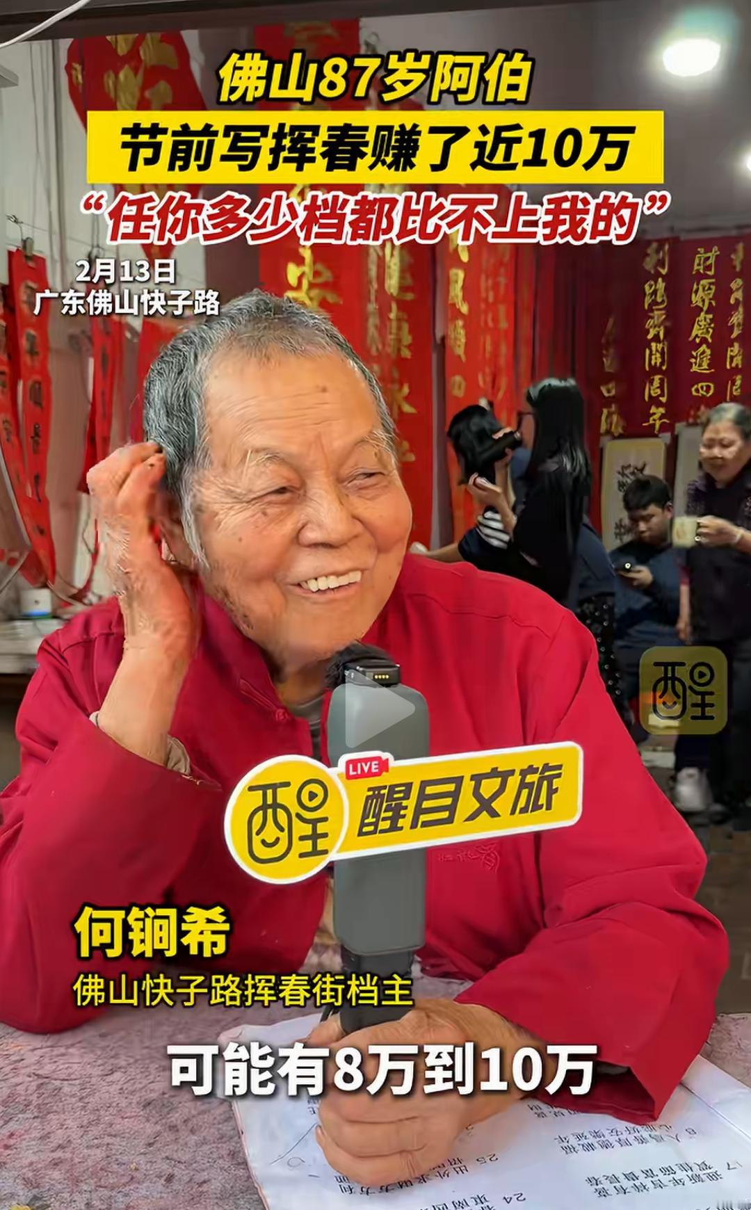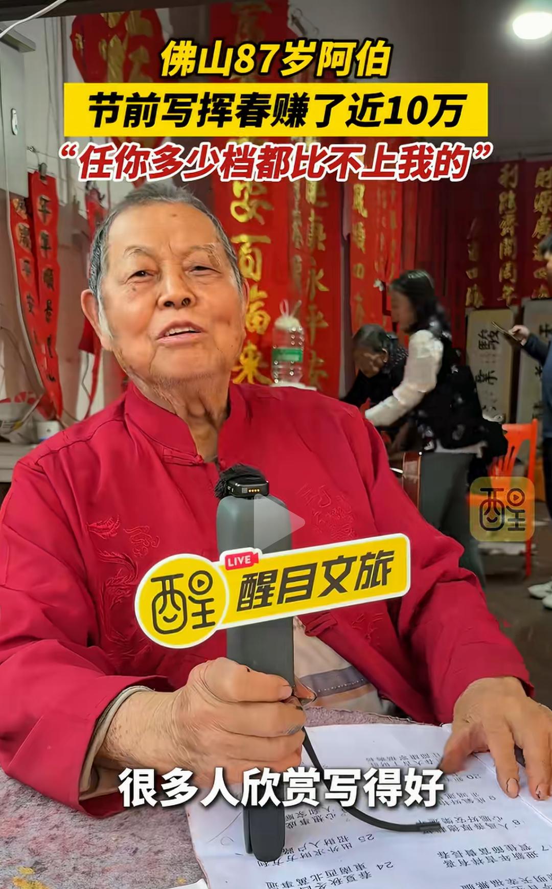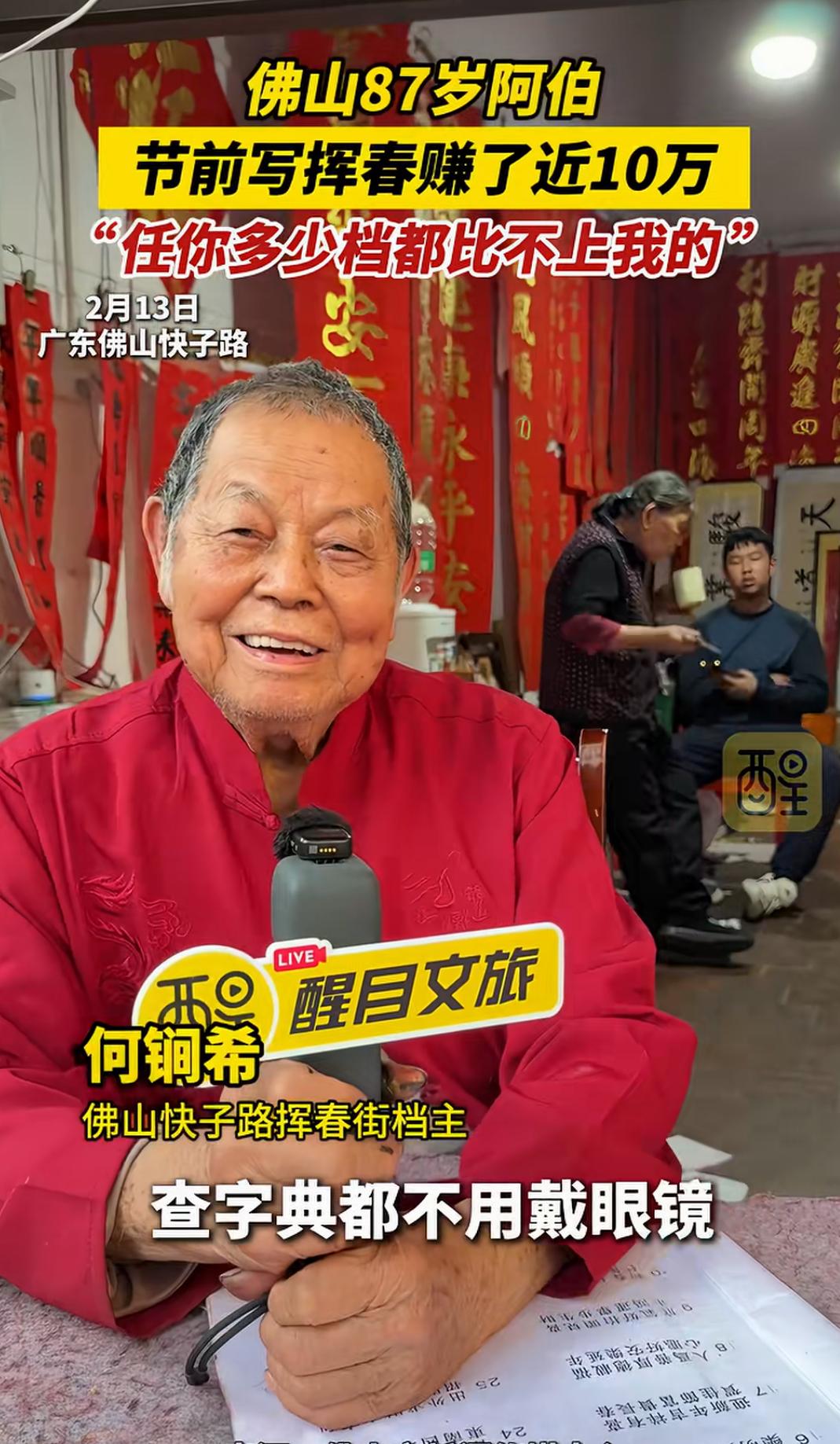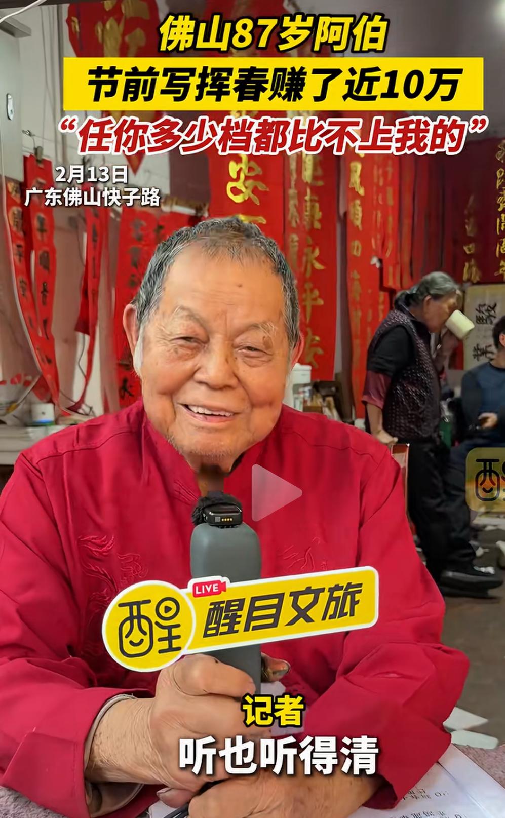 佛山87岁阿伯节前写挥春赚了近10万,自信“任你多少档都比不上我”的背后,隐藏着一段令人动容的人生故事,也折射出传统手艺的坚韧与魅力。这个年近九旬的老人,用一支毛笔和一颗热爱传统文化的心,书写的不仅是春联,更是一份跨越年龄、超越时代的坚持与自信。 你或许会觉得,87岁的老人还能靠写春联赚大钱?这是不是传统行业的“奇迹”?但真相远比表面更令人震撼。这位阿伯,几十年来坚守在那条熟悉的街巷,用心用情写下每一副春联。每一笔都饱含岁月的沉淀和对生活的热爱,他用一份坚持守护着一份文化的传承。节前的热闹市场,他的摊位总是人头攒动,不仅因为技艺,更因为那份真诚。 “任你多少档都比不上我”,这句话不仅是对自己技艺的自信,更像是一种对传统的坚守。如今,很多年轻人追逐潮流、追求新奇,似乎逐渐远离了那些历经岁月洗礼的手艺。而他,用实际行动告诉我们:真正的价值,是经过时间打磨的底蕴,是用心传递的温度。 赚了近10万,这个数字在很多人眼中或许微不足道,但在传统手艺人中,却是难能可贵的成就。更重要的是,这背后是他几十年的坚守,是对文化的热爱,是对生活的执着。这份收入,也许不及某些行业的“暴利”,但它代表了对一门技艺的尊重和传承的意义。 这个故事,激起了许多人的共鸣。我们身边,是否也有像他一样的“坚持者”?他们或许没有华丽的光环,却用一份执着守护着一份文化,用一份热爱温暖着身边的人。或许,我们也该反思:在快节奏的生活中,是否还能坚持那份初心?是否还能用心去做一件事,哪怕它看似微不足道? 更令人敬佩的是,他的自信不仅来自于技艺,更来自于对生活的理解和对传统的热爱。年龄不是障碍,而是人生阅历的积累;坚持不懈,才是真正的“档次”。他用行动告诉我们:只要心怀热爱,任何年龄都可以创造属于自己的奇迹。 这个春节,除了红包和烟花,也让我们多一些对传统的敬重和传承的思考。也许,下一个“春联大师”,就是你我身边的某个人,只要我们愿意用心去守护那份热爱。 看完这个故事,你是不是也被激励了?是不是也想拿起笔,写下一副属于自己的春联?别忘了,岁月可以带走青春,却带不走那份坚持和自信。让我们为这位87岁的“春联大师”点赞,也为每一个在平凡中坚持梦想的人点赞!因为,真正的价值,从不在于年龄,而在于那颗永不言弃的心。广东手写挥春
