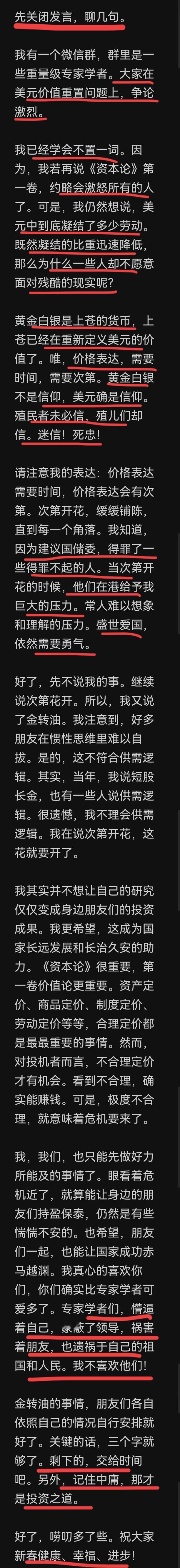 新的一年,卢总在粉丝群再谈美元价值重估问题,他还是认为,美帝,美元一定会被崩塌,你们为何不相信呢? 他甚至认为,我们跟美元的汇率,合理应该是1:3,这说明什么美元被严重高估了,1:3那一天一定会到来的,你们要记住,这需要一点时间,不能急~ 卢总还透露因为自己提出一些建议,被资本和一些势力视为眼中钉肉中刺,一度他还处于危险的境地,有犹太资本还发文赤裸裸的威胁他让他闭嘴! 卢教授,提出了直接税立法,建立国储委对资金已经全球监管,要对一些人征收离境外税,弃籍税,他认为解决这个根本问题,经济才能快速恢复和振兴! 为何,就是因为走资太猛,之前,至少21万亿资本跑路,造成资本积累率严重不足,我们经济疲软主要是这个原因! 如果能一揽子系统解决走资,沉没,空转这三大难题,构建全国水循环系统,我们的经济可以保持8%的高速增长,并能维持20年之久,不但经济发展得解决,更能实现全民共同富裕的伟大目标! 太厉害了,卢总! 卢麒元被粉丝称为国师,他的超级建议提出很多年了,为何没被采用呢,我也是想破脑袋也想不出来,百思不得其解,对于卢总的这些超级大建议,你认同么,有何高见呢?