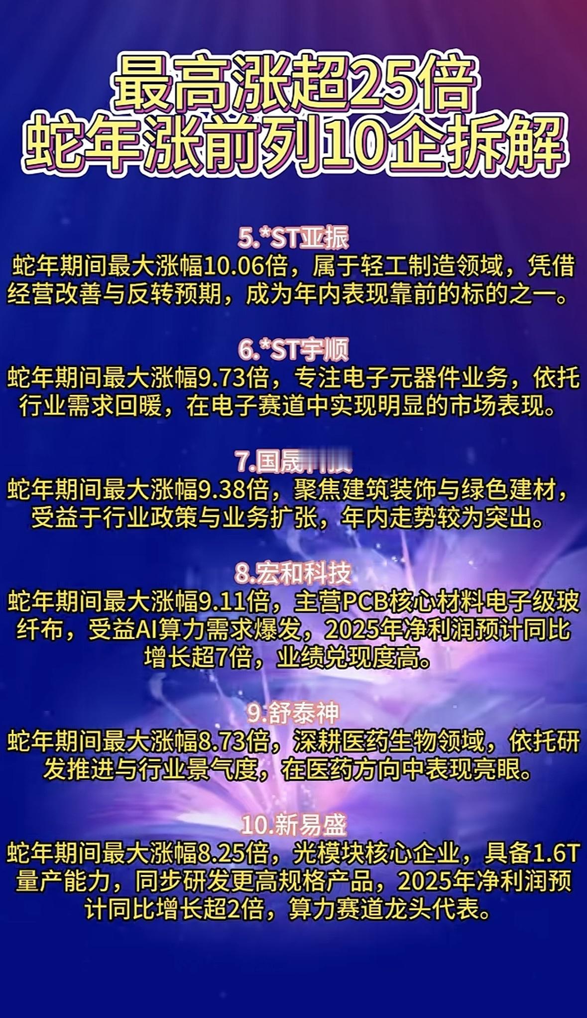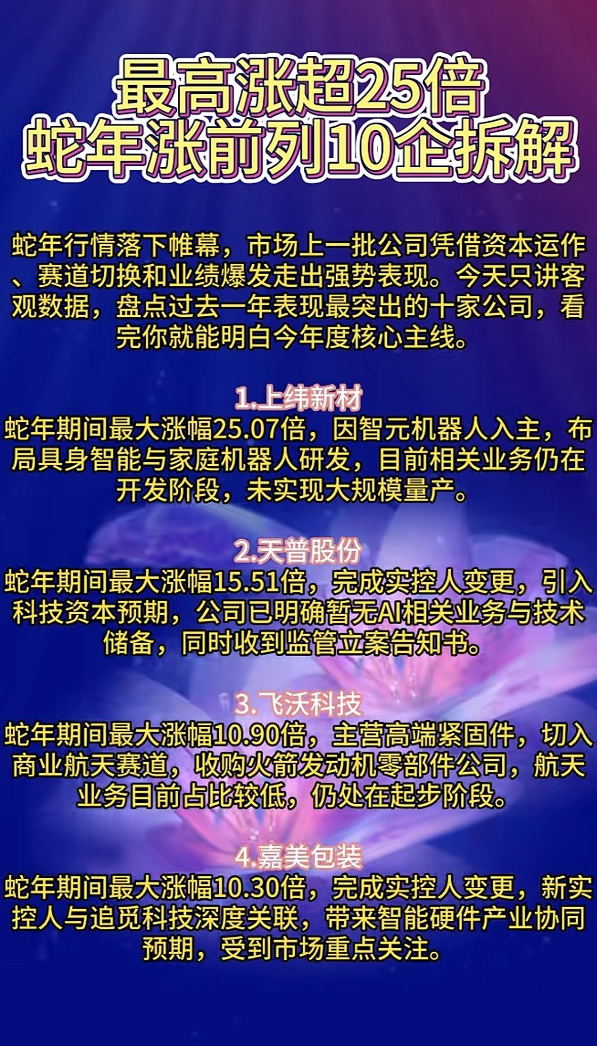 2025蛇年A股行情太猛了!从2025年2月5日到2026年2月13日,上证指数累计涨25.58%收于4082.07点,深证成指涨38.84%,创业板指涨58.73%,科创综指更是涨了64.20%,A股狂涨32万亿,堪称近十年最赚钱生肖年。 剔除2025年后上市的新股,蛇年十大牛股揭晓。上纬新材以1837%涨幅居首,它有具身智能机器人业务,不过还在产品开发阶段;天普股份涨943%紧随其后,其股东中昊芯英启动IPO已进入股改阶段。这行情太让人眼红,不知道马年又会怎样呢!