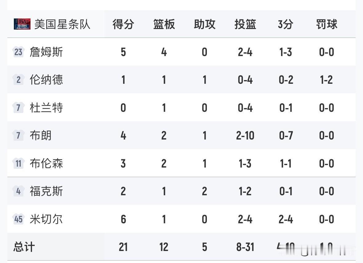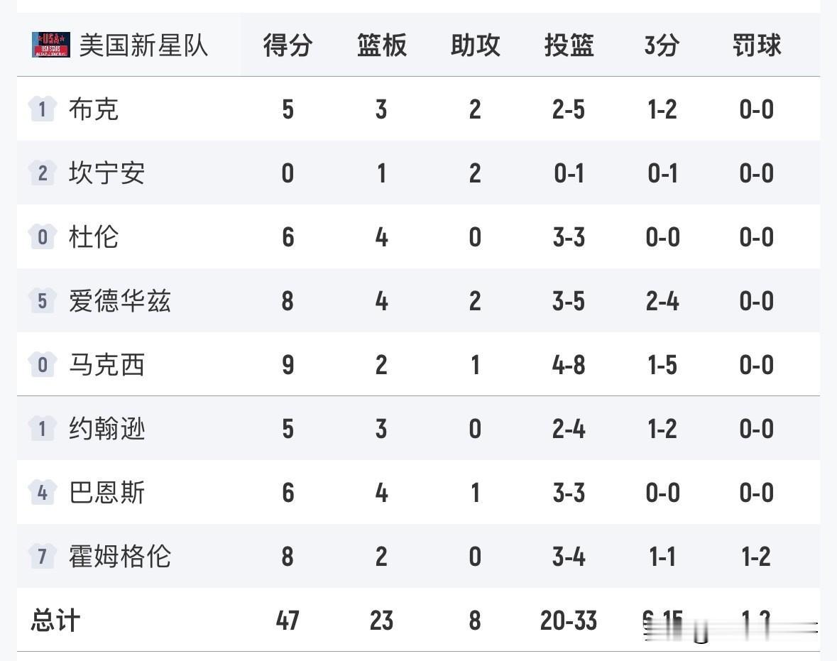 体力不支!!!星条队老头们没能扛住新星队的冲击落败!新年爱好打卡 全明星正赛最终的决赛结束了,星条队47-21不敌新星队,老头们的体力不支,跟新星队不是一个等级了,新星队仍然保持很猛的冲击力。 星条队上来就被新星队打了个12-1,直接把老头们打懵圈了,而接下来他们进攻略有好转,比赛进行到剩余6分钟的时候他们被打成了26-9,这也注定了他们落败的结局。 恭喜新星队,他们依靠自己的优势战胜了星条队,星条队连续的三次比赛耗费了这帮老头们的体力,这是双方最明显的差距。NBA全明星 詹姆斯 杜兰特