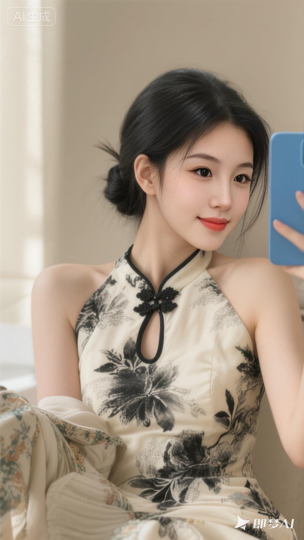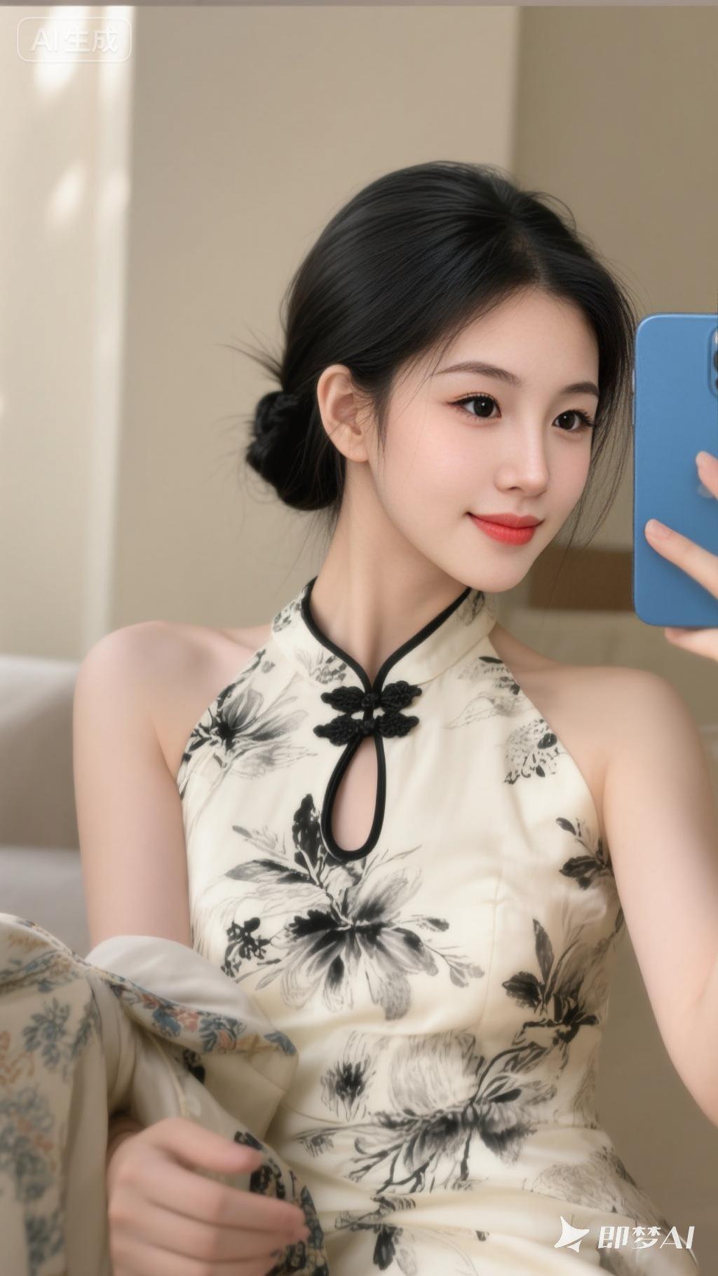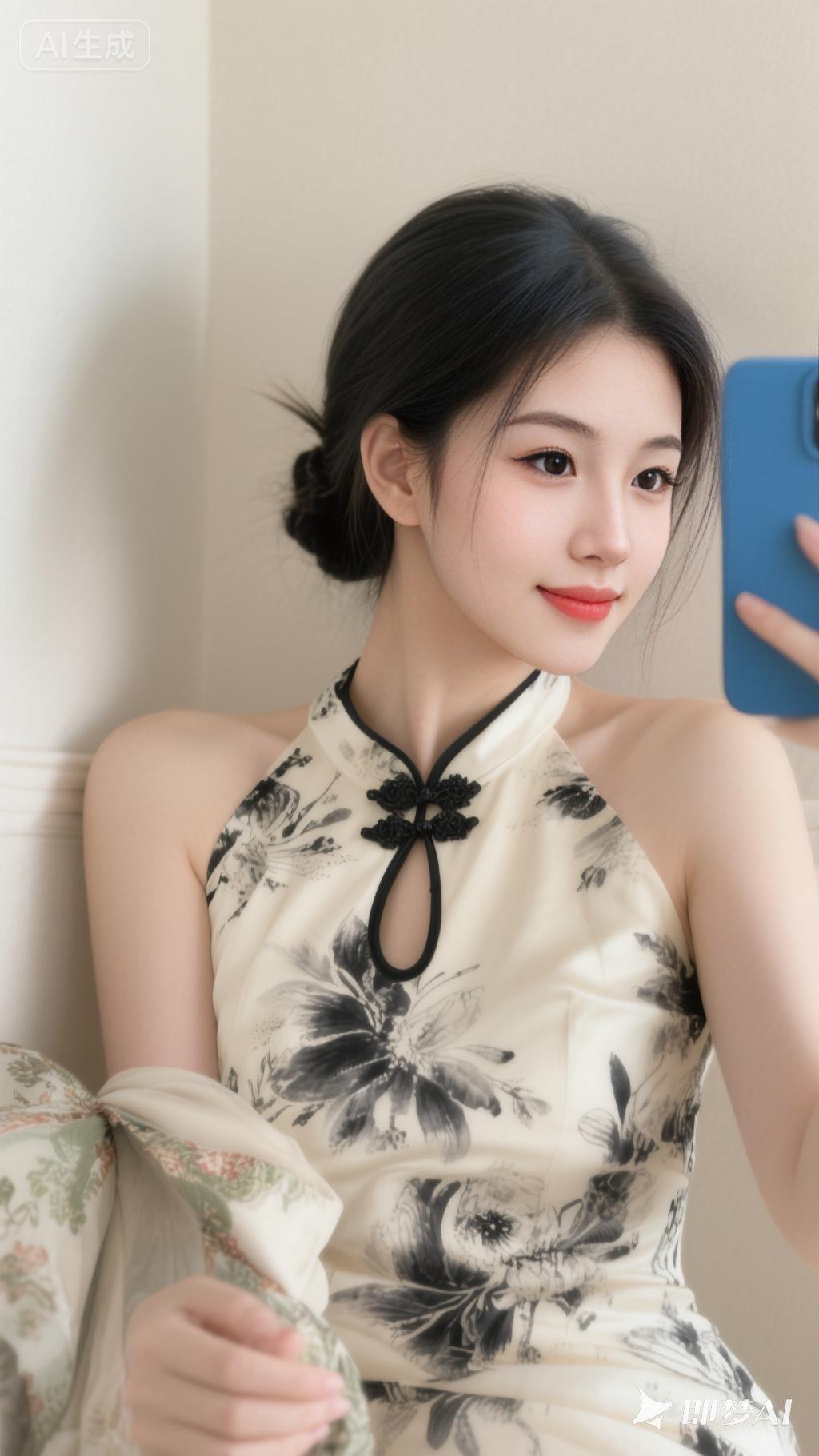 一位年轻女性,黑发优雅盘成发髻,身着米白色底配黑色水墨花卉纹的挂脖改良旗袍(领口镂空、黑边装饰),手持蓝色手机自拍,手臂搭着带有花纹的衣物