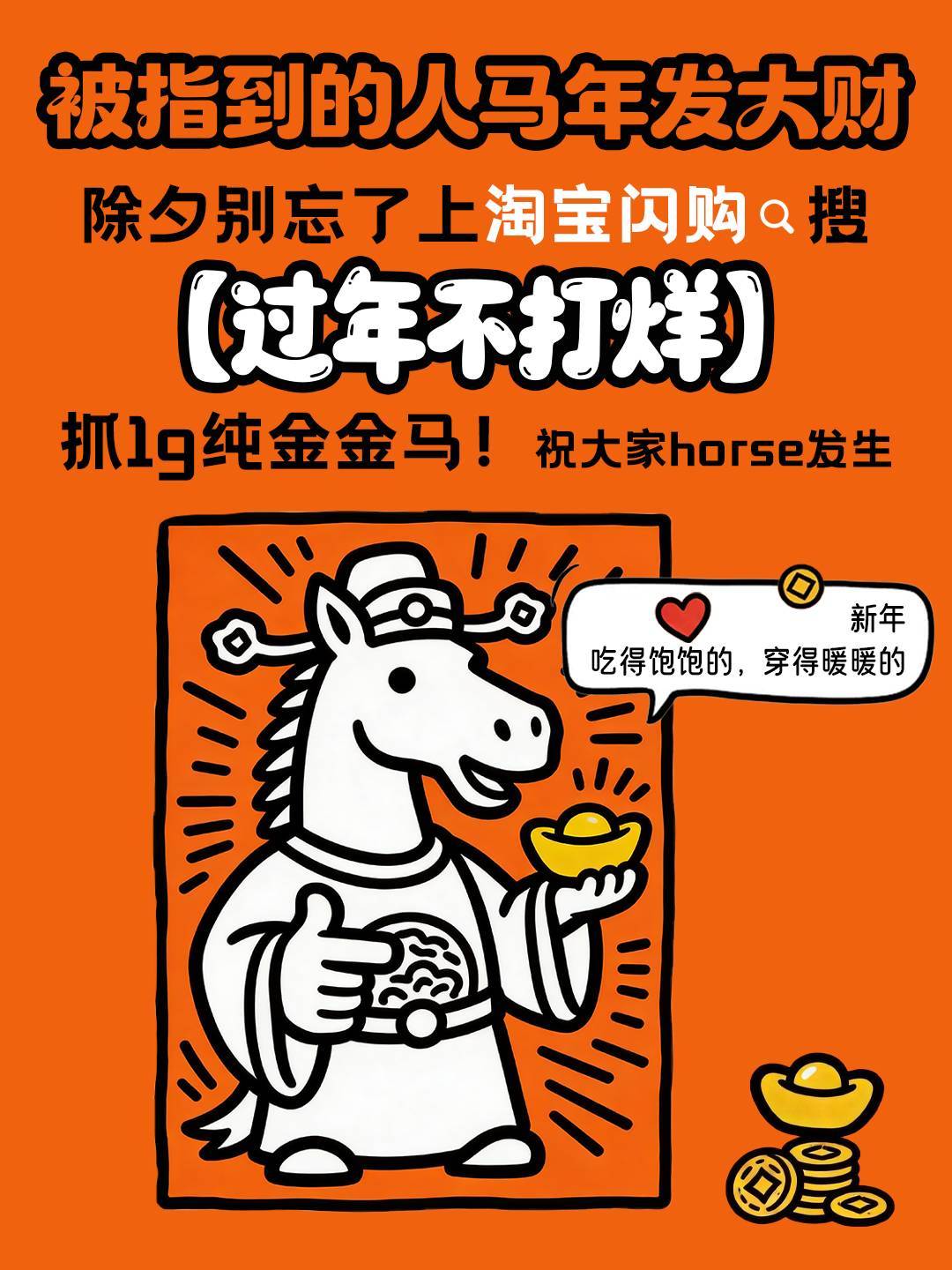 过年上淘宝闪购抓金马赢好运淘宝闪购过年不打烊谁懂我看到「1g纯金金马」的激动心情!淘宝闪购这一波抓金马互动超会玩🥰很期待过年时候和家里亲戚一起玩抓金马的画面了~淘宝闪购🔍【过年不打烊】,抽百万份好礼,赢1g纯金金马,新年好运更快到家!带着亲朋好友一起抓金马真的很幸福啊!