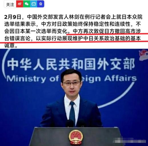中方对日本政府的表述有改变:从日本政府变成了日本执政当局同时持续要求日本高市必须撤回涉台危险言论!回应日本的选举,中方表示日本选举政局与中国无关对中国毫无影响,中方依然持续发展壮大! 2026年1月的北京,当聚光灯打在第35任发言人的身上时,这位在外交战线摸爬滚打了23年的老将,没有像往常那样进行礼节性的寒暄,他抛出了两枚重量级的“震爆弹”:不仅罕见地使用了“血债必须偿还”、“罪行必须清算”这种极具物理痛感的措辞,更在一个不起眼的细节上完成了某种质的切割,对海对岸那个政权的称呼,从“日本政府”悄然降级为了“日本执政当局”。 这几个字的变动,绝不是编辑校对的失误,而是从法理和政治高度上的一次精准狙击。 要知道,就在不久前,有着“平成女魔头”之称的高市早苗正沉浸在巨大的胜利喜悦中,她带领自民党拿下了议会三分之二的多数席位,这场“压倒性”的选举胜利似乎让她产生了一种错觉,以为只要手里握着选票,就可以把“台海有事就是日本有事”的狂言变成国家意志,甚至可以把武力介入台海摆上台面。 但北京的反应直接给她泼了一盆液氮,中方的逻辑很简单:你选举赢多少票,那是你自家的事,中国不干涉,也不感兴趣,但只要你触碰了那条红线,你在我们眼里的“合法性”就归零了,你不再是一个受尊重的谈判对手,而只是一个需要被管控的“当局”。 这种定性一旦确立,随之而来的就是雷霆万钧的手段。 看看1月15日那天发生了什么,日本外相茂木敏充火急火燎地飞往马尼拉,皮包里塞满了军事后勤互助协议,送TC-90巡逻机、送相控阵雷达,甚至还在琢磨着让自卫队常驻菲律宾,这算盘打得隔着太平洋都能听见:想拿菲律宾当跳板,把第一岛链的封锁线强行往前推。 可惜日本人的地图作业做得太一厢情愿了,解放军并没有选择在东京湾跟他们打嘴仗,而是直接在巴士海峡以东做了一场无声的“外科手术”,歼-35隐身战机编队的常态化巡航,像一把锋利的手术刀,物理上切断了日本本土通往菲律宾的关键大动脉。 国防部发言人张晓刚那句“自食苦果”的话音未落,南部战区和东部战区就已经完成了跨战区联动,你这边刚想搞“日菲准同盟”的连线,那边线路就已经被掐断了,所谓的战略围堵瞬间变成了一场独角戏。 但这还不是最让东京感到窒息的。真正的痛感,来自于工业血管的坏死。 信任这东西,一旦透支就是负资产,从福岛核污水数据造假,到监测显示周边海域氚浓度飙升47倍,日本在环境问题上的那点信用早已破产,既然“背信弃义”在前,那就别怪中方“两用物项出口禁令”在后。 1月初的公告字数不多,杀伤力却极大,稀土和特种金属的断供,直接让日本引以为傲的军工产业陷入了原料饥渴,三菱重工和川崎重工的生产线面临停摆,那些精密的战争机器没了原材料,就是一堆废铁,日本经团联的大佬们急得团团转,想来华求情,结果吃了个结结实实的闭门羹。 想一边砸中国的锅,一边还想赚中国的钱?这种好事,彻底翻篇了。 外部的高压,最终不可避免地传导回了日本国内,变成了政坛的雪崩,高市早苗原本指望靠强硬的外部姿态来转移国内矛盾,结果回旋镖扎在了自己身上。 北海道和青森的水产从业者们愤怒了,他们的生计因为政府的鲁莽外交而毁于一旦,抗议声浪此起彼伏,直接击穿了高市的政治基本盘。 那个曾经高高在上的32%支持率,在极短时间内断崖式暴跌至18%,在政治世界里,这个数字意味着“植物人”,自民党内部的嗅觉是最灵敏的,他们迅速成立了专项小组,实质上已经架空了高市的政策主导权。 这位曾经不可一世的“赢家”,如今已经沦为了右翼阵营急于抛弃的“止损工具人”。 这一切正如中方之前所警告的那样:必将遭到日本人民的抵制,历史的账本从来都不会因为时间的流逝而模糊,南京的城墙、重庆的防空洞、731部队的遗址,这些记忆刻在骨血里。 当“血债必须偿还”这六个字在蓝厅回荡时,它不再仅仅是一句口号,而是正在发生的现实。 对于那个所谓的“执政当局”而言,摆在面前的选择其实已经不多了,要么吞下那些危险的言论,老老实实回到和平发展的轨道上来。要么继续在死胡同里狂奔,直到撞得粉身碎骨。 勿谓言之不预,这句古话的分量,现在的东京应该听得懂了。