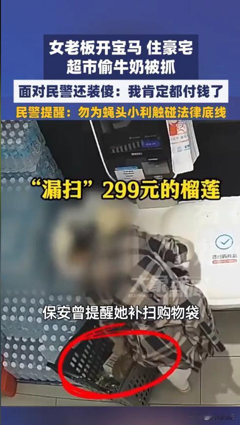 “活不起了?”近日,一位开宝马、住豪宅的女老板到超市购物结账时,竟利用自助结账机,在无人看管的情况下将一个水果礼盒不扫码就装入袋中!超市报警后,警察调查后才发现,这位女老板还曾多次漏扫商品。网友:这么有钱还偷东西,何必呢? 在常人的认知里,开豪车、住豪宅的人应该衣食无忧,但这位女老板的行为却颠覆了大家的想象。 据媒体2月4日报道,当天,这位女老板像往常一样逛超市,在挑选好商品后,她就来到自助结账机面前,象征的扫了几个产品后,又偷偷漏扫了几个,将它们装入袋中,浑水摸鱼。 而后保安见到商品处没有扫码购物袋,还上前提醒女子别忘了。没想到女子完全装作看不见,等保安走后,她就直接拎着东西走了。 超市报警后,发现东西是被一个开豪车的女子漏扫拿走的,也很是不理解。还以为是女子忘记了扫码。可是警察调查后才发现,女子虽然住着高档小区,但是每次购物时基本都漏扫商品,比如进口榴莲,牛肉等,可见就是故意不付钱。 据了解,这位女老板经营着一家公司,经济条件十分优越,开宝马、住豪宅,完全不差这几瓶牛奶的钱。民警表示,她的行为已经涉嫌盗窃,将面临相应的法律处罚。 网友表示,真不理解,都当老板了,还差这几个钱,简直太丢人了。也有网友调侃到,钱都是这么省出来的吧? 信息来源:《女老板开宝马住高端小区,却多次在超市盗窃,面对民警时还装傻》羊城晚报