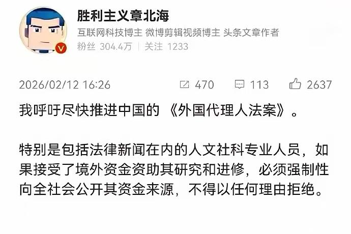 我们国家要尽快推出外国人代理法。其实我以前也讲过这个事情。为什么国内公知那么嚣张?就是我们没有法律管制他们。所以才造成了那么多公知在网络上肆无忌惮的宣扬西方的意识形态。他们这些人都是拿了外国人的钱给外国人办事。我们应该叫他们卖国贼。其实他们就是卖国贼,没有什么好讲的。对于这些人,国内一定要立法。只有立法了,才会让这些人老实。同志们,你们说呢?