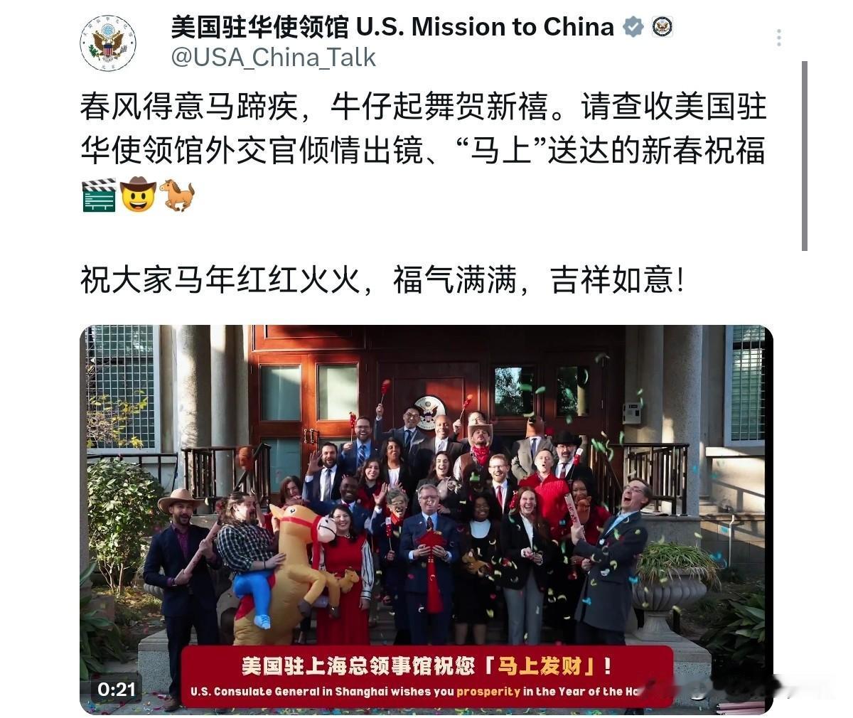 让人很是意外!美国驻华使领馆第一时间给我们送上别具特色的新年祝福,网友评论,美国大使馆太有心了!2月16日,美国驻华使领馆发文表示,春风得意马蹄疾,牛仔起舞贺新禧。请查收美国驻华使领馆外交官倾情出镜、“马上”送达的新春祝福🎬🤠🐎! 祝大家马年红红火火,福气满满,吉祥如意! 说实话,美国大使馆发出的新年祝贺,确实是用心了。美国牛仔穿着中国红的服饰,骑在象征“马年”的骏马之上,骏马配饰红色的“头花”,铺上红色坐垫。骏马驰骋,中国节微风中摇曳,春节氛围拉满。当下立春已到,这不由得让人联想到春风得意,马到成功等等。 当然,这样的祝贺是象征性意义的,但更超越了象征性意义。联想到中美最高层级在立春那一天通话,或许,美国借此既想要表达对我们的祝福,也希望中美关系在今年春暖花开,达成更大的共识,促成更大的合作。春节来临之际,美国释放了极为友好的信息,这样的善意,这几年可并不多见。