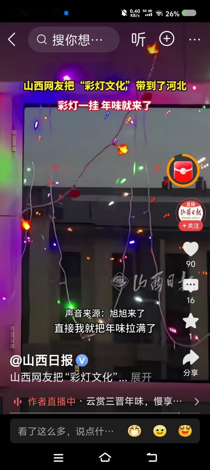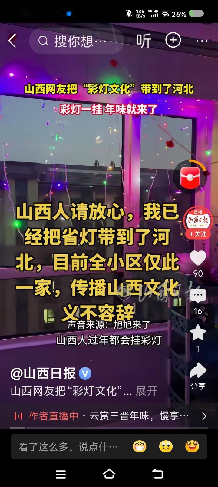 山西人在家挂彩灯?—— 据报道,某山西人在河北,过年在家挂彩灯,把年味拉满了。“山西人请放心,我把省灯挂到了河北。” 点评: 一、为了公平,我允许在山西的河北人在家在小区挂点啥。腊肉,柿子,辣椒…… 二、我在山西南部,这边几乎没有在家挂彩灯的。新婚可能会挂。