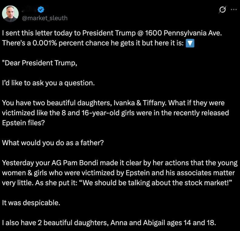 一位美国父亲最近在社交媒体上给特朗普发了封“灵魂拷问”公开信,字字带火,句句扎心。 马里兰州的股票分析师约翰写道: “总统先生,你有两个女儿,伊万卡和蒂芙尼。如果她们像爱泼斯坦档案里那两个8岁和16岁的女孩一样被侵害,你会怎么做!”这不是煽情,是质问。 就在前一天,美国司法部长邦迪轻描淡写地说:“现在该聊的是我们的股市!”把受害者踩进尘埃,把资本话题捧上神坛,这态度,让无数父母怒火中烧。 约翰说,他也有两个女儿,14岁和18岁。“如果她们受害,我会亲手干掉施暴者,哪怕坐牢一辈子。”这是一个父亲最原始的愤怒与守护。 他质问:每一个受害女孩背后,都有一个心碎的父亲。为什么权贵能全身而退,普通人连一句公道都求不到, 爱泼斯坦案拖了十几年,主谋“离奇”死在戒备森严的监狱,监控“恰好”失灵,名单里的大人物至今安然无恙。司法部连提都不愿提,只顾着喊“看K线图去吧”,这让民众如何相信正义还存在。 这不是政治问题,是人性底线。你可以不在乎真相,但别指望天下父母沉默,约翰的信或许到不了特朗普案头,但它戳破了一个残酷现实,当权势能买断正义,普通人的孩子就成了待宰羔羊。 这封信不只为受害者发声,是对整个体制的怒吼:“我的女儿,不该活在一个施暴者能笑着离场的世界。”