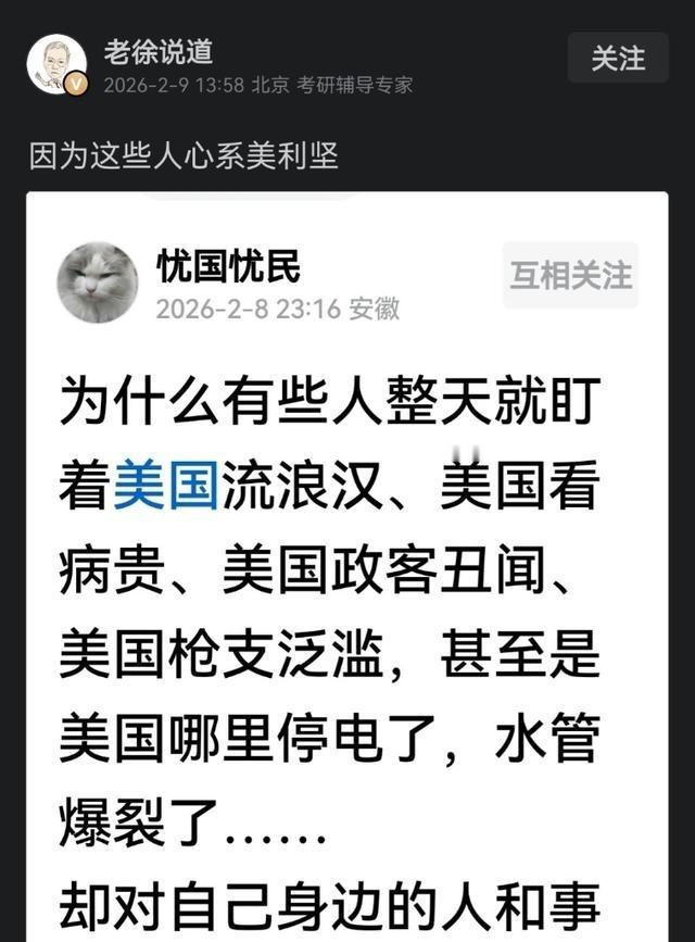 “为什么有些人整天就盯着美国流浪汉、美国看病贵、美国政客丑闻、美国枪支泛滥……却对自己身边的人和事漠不关心?”对于这个问题,京城老徐2月9日给出了答案:因为这些人心系美利坚。 某些群体每日搜寻美国街头无家者统计,议论医疗账单破产案例,追踪官员腐败事件,还记录枪击频率,却少留意自家社区新设休闲区或邻居收入增长。这种倾向源于内心偏向境外,忽略本土事实。 他们固定视线于太平洋对岸缺陷,塑造单一视野,对国内隧道开通、福利扩展、安全管理无动于衷。胡锡进指出,这种以境外为基准习惯反映自知不足。他们借他国弱点突出本土优势,筑起封闭信息网,却遗忘各国轨迹各异,无一全优。 留意美国纷扰本为资讯获取,若因此轻视本土日常,便颠倒轻重。本土变动如边疆电网全覆盖,让山区居民用电稳定,而非过去断续;灾害预警迅捷,民众几小时疏散,而不是仓促。 这些人易陷双标泥潭。美国缺陷视为体系结果,本土小瑕则视为大祸;美国成绩当作寻常,本土创举则一笔带过。这种评估脱离实际依据。他们的憧憬投向外域,不愿致力本土提升。就似自家耕地弃置不管,却每日检视邻地瑕疵,终在怨言中丧失切实收获。 同时,开车游览县级高速体系,体验从市区到乡野的无碍联接;运用网络政务系统,申办证照只需提交文件,三天办结,而不是耗时排队;目睹昔日贫区新颜,住宅修缮,医疗机构设备刷新,患者就诊用上数字仪。这些经历表明,国家前进融入平常琐事,不是抽象概念。 国家前途与个体相连,关注本土事项、投身街区事务、推动本地前进,才为切实路径。一味颂扬外域、指摘本土,仅成旁观,而非行动者。明智在于检视美国优缺,也直面本土成就与难关;根植本地化解,而非远距指责。 这犹如持金器乞食。本土日子渐趋宽裕,却总感他人简餐更诱,无视掌中珍贵,这种念头既谬误,又惋惜。 他们锁定太平洋彼岸问题,塑造固定视野,对国内隧道开通、居民保障扩展、安全巡查无视。胡锡进提及,这种参照境外习惯反映自知不足。他们用别国短板比照自家长处,构筑封闭认知环,却忘却各国道路独特,无绝对完备。 关注美国杂乱本属资讯搜集,若因此忽略本土生活,便舍近求远。本土转变如边疆电网覆盖全境,让山区村民用电稳定,而不是过去断续供电;灾害预警机制迅捷,民众几小时内疏散,而不是仓促应对。 这些人常陷双标怪圈。美国社会弊端看作结构产物,本国微末则放大为不可饶恕;美国进步视作必然,本国跃升则贬为寻常。这种逻辑偏离客观准则。他们的向往置于异邦,不愿加入本土改良。就如自家园地闲废不管,却天天审察邻园不足,终在牢骚中错过实际利益。 同时,自驾探访省级高速网格,感受从城镇到边陲的顺畅通行;利用数字政务门户,缴纳税款只需在线填写,一周审核,而不是纸质奔波;观察原欠发达区新貌,道路硬化,教育设施更新,学生上课用上互动屏。这些体现实显,国家进步嵌入日常点滴,不是虚言。 国家命运与个人紧密,留意本地话题、参与社区工作、支持本土推进,才是最实态度。一味推崇外邦、苛责本土,只成观众,而非建造者。清醒在于既见美国长短,也视本国成绩与挑战;立足本地处理,而非隔海评点。 这如同执金碗讨饭。自家生活日趋富足,却总觉他人粗粮更香,无视手中价值,这种心态既荒唐,又可叹。