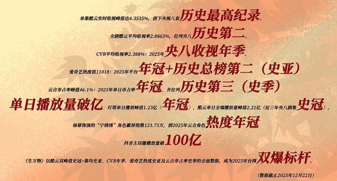 杨幂主演的生万物更是以酷云双峰值史冠+集均史亚、CVB年季、爱奇艺热度史亚以及云合市占率史季的全面数据,成为2025年台网双爆标杆。
