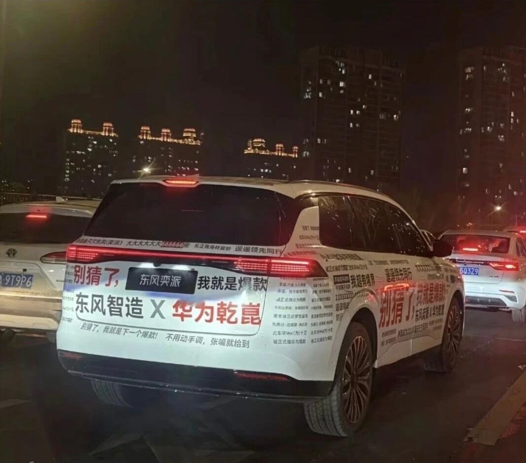 什么“别猜了,我就是爆款”,还有“东风智造X华为乾崑”,连“遥遥领先同行”都印上去了,等于把自己的合作方、卖点全明明白白写在车身上了。