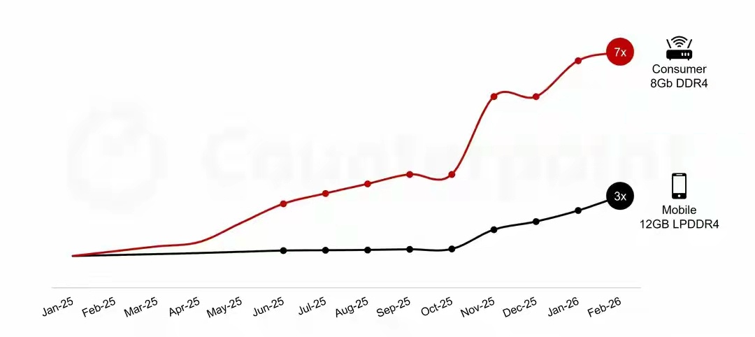 据Counterpoint Research市场研究公司2026年2月发布的最新《内存价格追踪报告》显示,受人工智能服务器领域高利润需求激增的推动,面向消费类应用的DRAM和NAND内存价格在过去一年中飙升超过600%。这一涨幅波及从个人电脑、低端智能手机到路由器和机顶盒等广泛的消费电子产品领域。报告预计,内存价格将持续上涨至2026年6月,即便成本可能在2026年上半年触顶,供应紧张状况仍将持续存在。