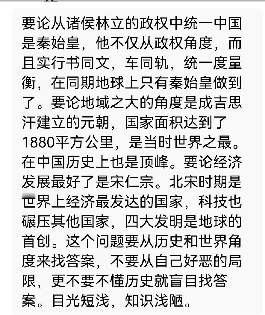 我比较赞同这个观点。探讨历史问题必须在历史的长河中寻找答案,跳出自己认知,超越自己所处的时代局限。历史上历经800年的政权有,延续400多年,300多年,200多年的有汉,唐,宋,元,明,清,百十左右年的比比皆是。不乏秦始皇,汉高祖,汉武帝,唐太宗,宋太祖,成吉思汗,明太祖,清努尔哈赤,康熙等一代大帝。历史唯物主义不仅是一面镜子,还是衡量时代和人物的标准。不要把某一人物的一句话奉为圣旨,把一个认知当做颠扑不破的真理。 (元朝中国的疆域达到1880万平方公里)。