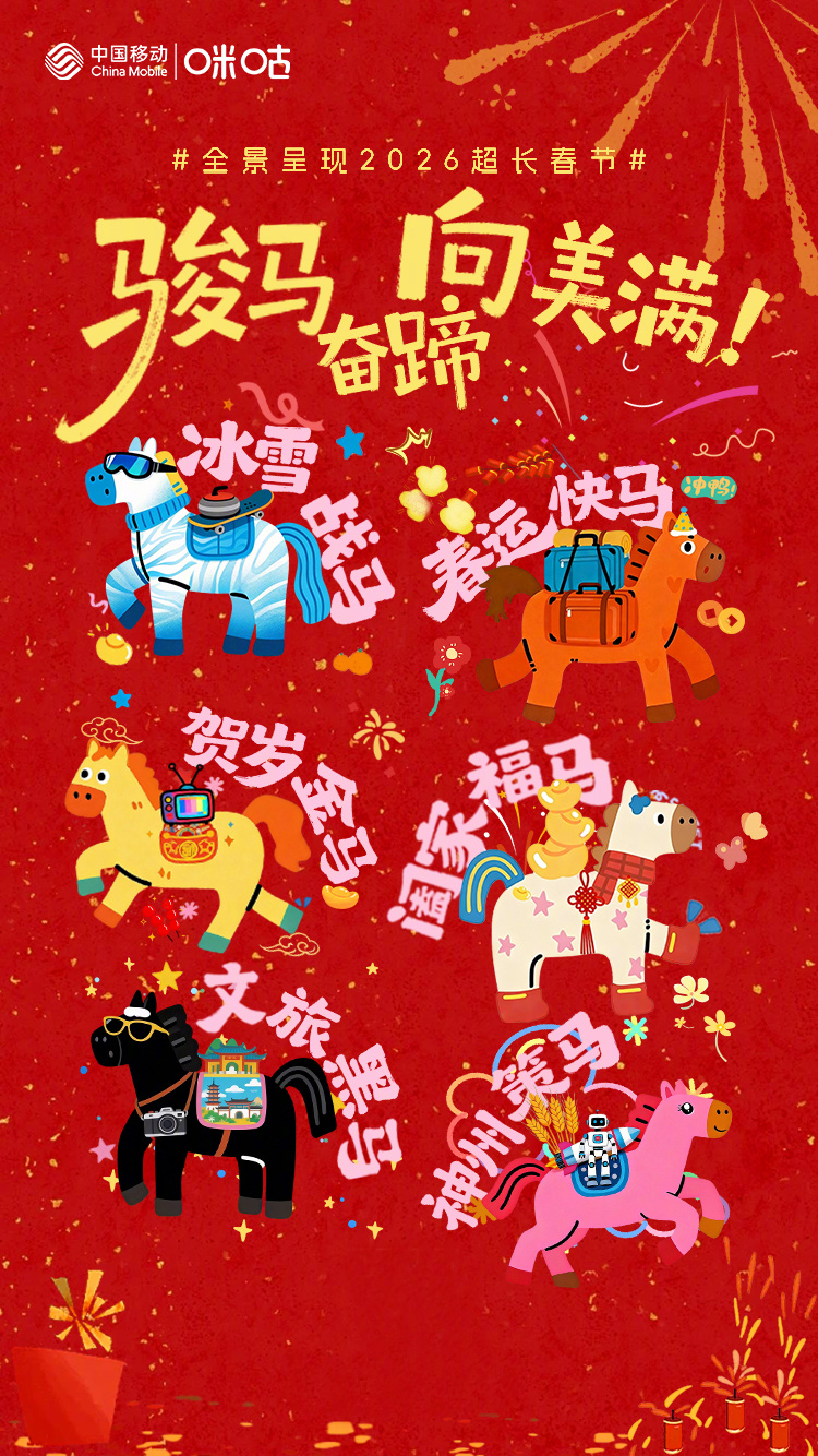 #好多吉祥小马向你奔来#骏马奋蹄向美满!2026超长春节年味拉满,咪咕联合多家融媒全景呈现马年春节——阖家福马、文旅黑马、贺岁金马、冰雪战马、神州策马、春运快马,六大主题解锁击史上“最长春节假期”,带你策马过个精彩年!戳→网页链接