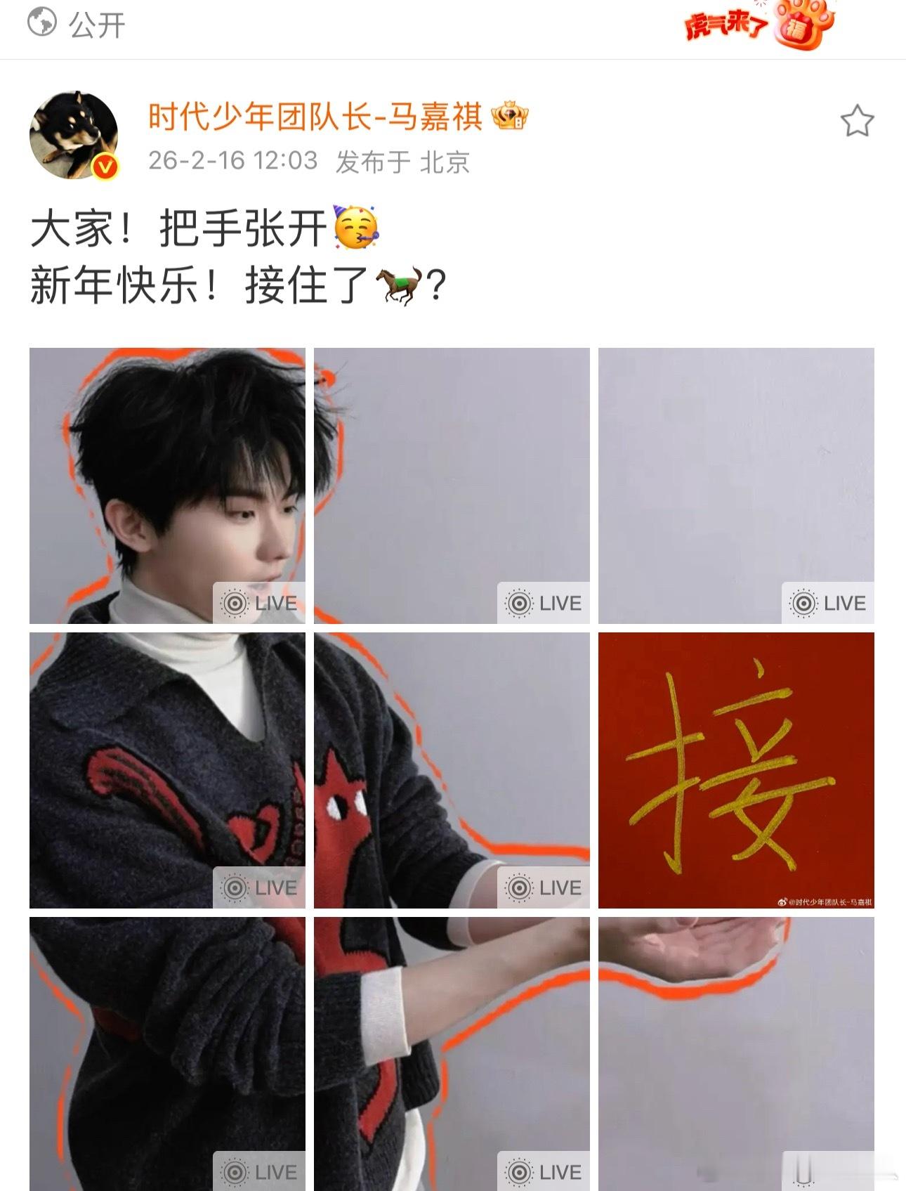 马嘉祺 你的马来了马嘉祺微博里好多马啊,过个马年马嘉祺忙坏了我双手接住马嘉祺的这些马:一马当先,马力全开,马到成功,立马转运,超多马内,幸福加马,神马都好祝马年大家都像马嘉祺说的这样,神马都好‼️‼️‼️‼️00后新生代热点捕捉计划春节刷到宝了