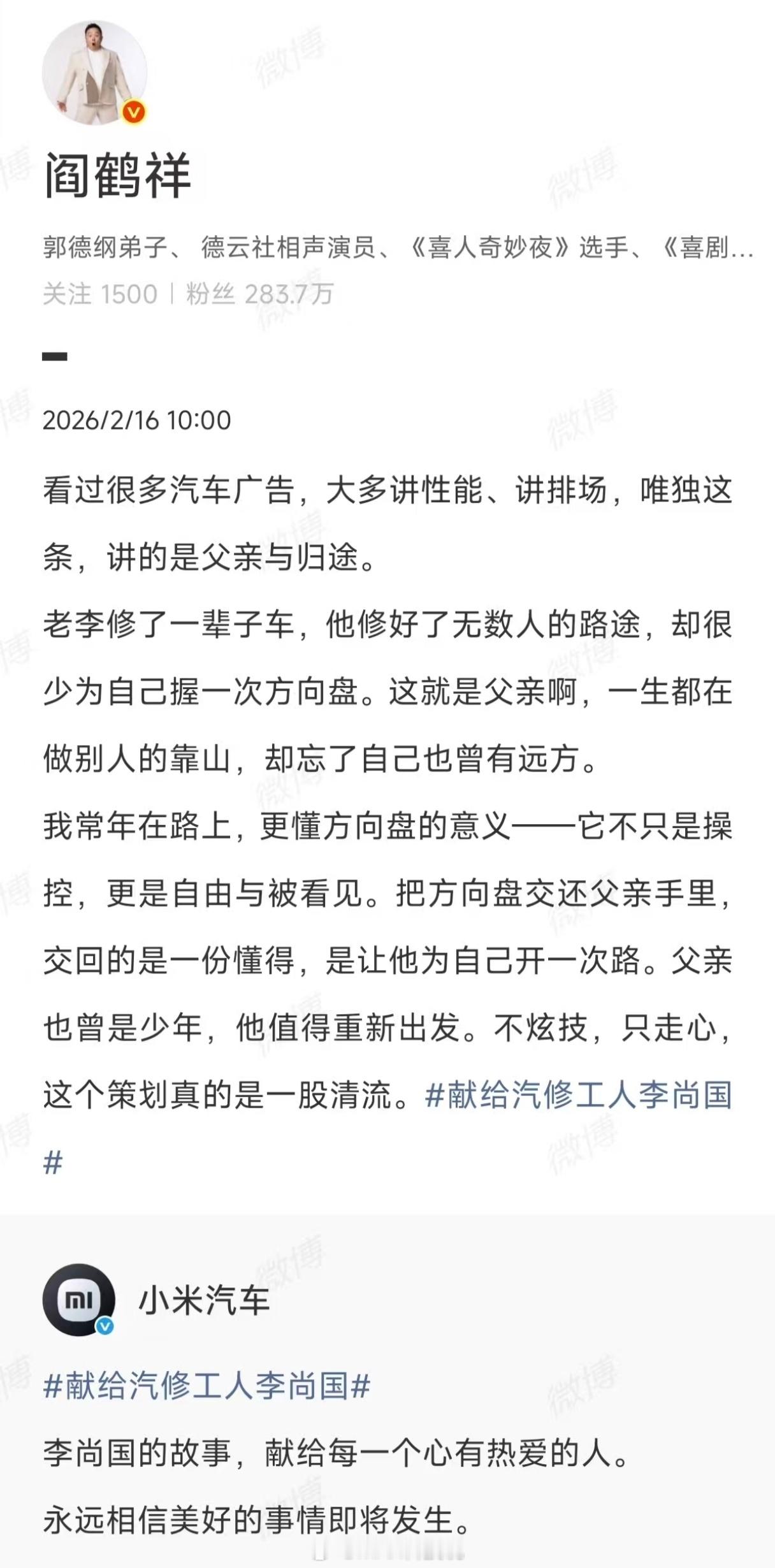阎鹤祥式共情又上线了这个转发点评非常到位:老李修了一辈子车,修好了无数人的路途,却很少为自己握一次方向盘。