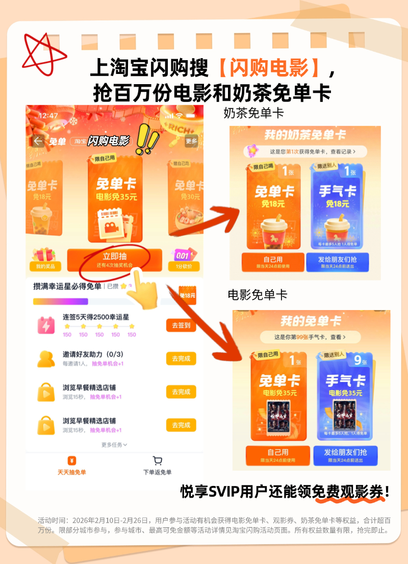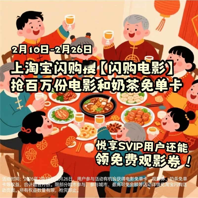 蹲了一晚上明星红包,手速慢的我只能看着“已抢光”三个字发呆但新年嘛,主打一个心态好!抢不到红包就抢电影免单卡《惊蛰无声》搭配《镖人》,悬疑武侠全拿下!2月10日-2月26日,淘宝闪购请你看电影喝奶茶,淘宝闪购过年不打烊,上淘宝闪购搜【闪购电影】,抢百万份电影和奶茶免单卡,悦享SVIP用户还能领免费观影券!一人血书求同好搭子!电影票没花钱而且还有免费奶茶喝, 过年上淘宝闪购抢电影奶茶免单就是这么爽!淘宝闪购过年不打烊,新年好运更快到家!过大年就该看大片才对味啊~