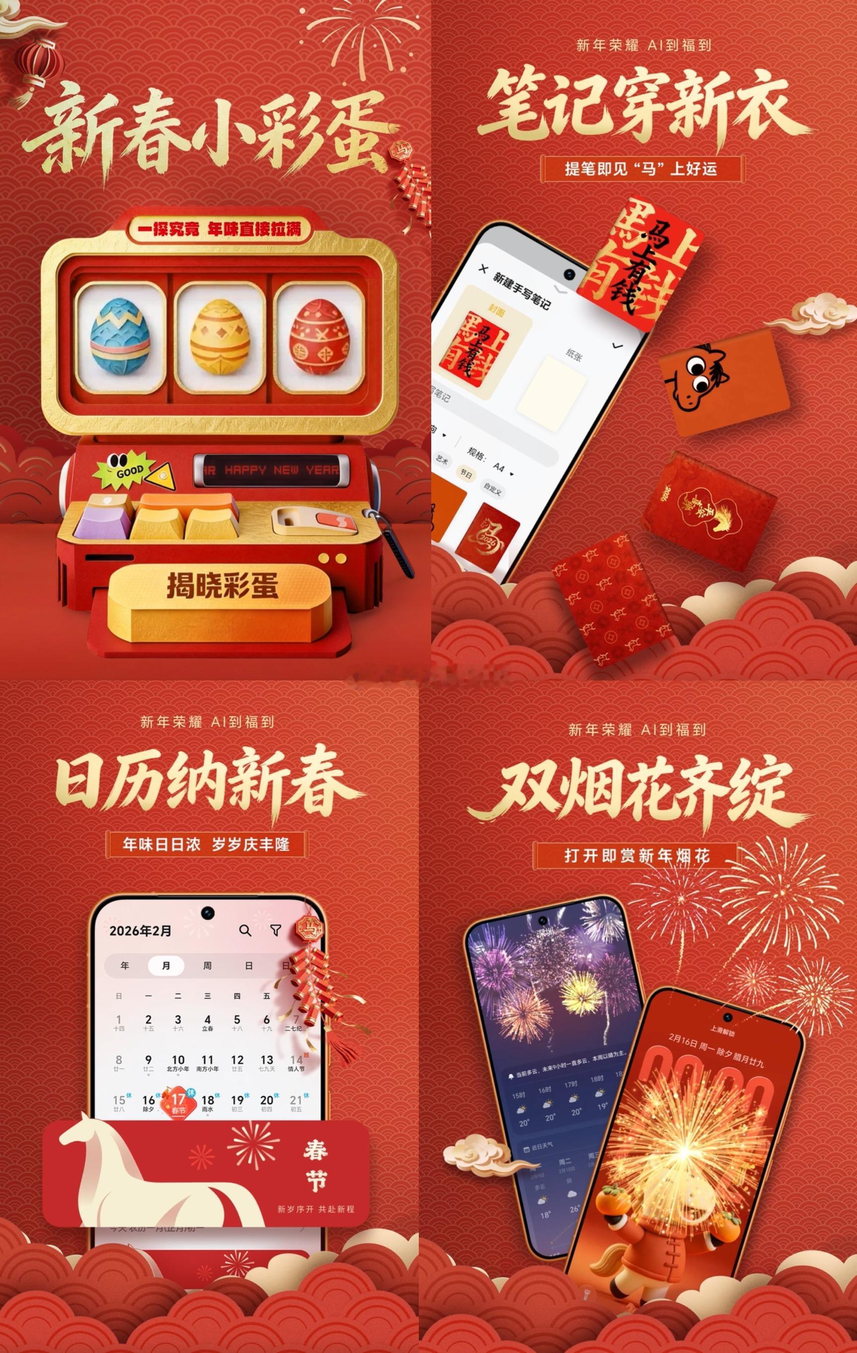 荣耀正式揭秘新的MagicOS彩蛋,在锁屏和天气里都藏了烟花绽放,今天晚上8点到初一24点都能解锁。还加入了笔记封面和6款春节氛围新装,日历也有新春限定皮肤,今年荣耀太卷了,春节期间氛围都搞起来了,大家可以去看一看。新年荣耀AI到福到MagicOS月月新