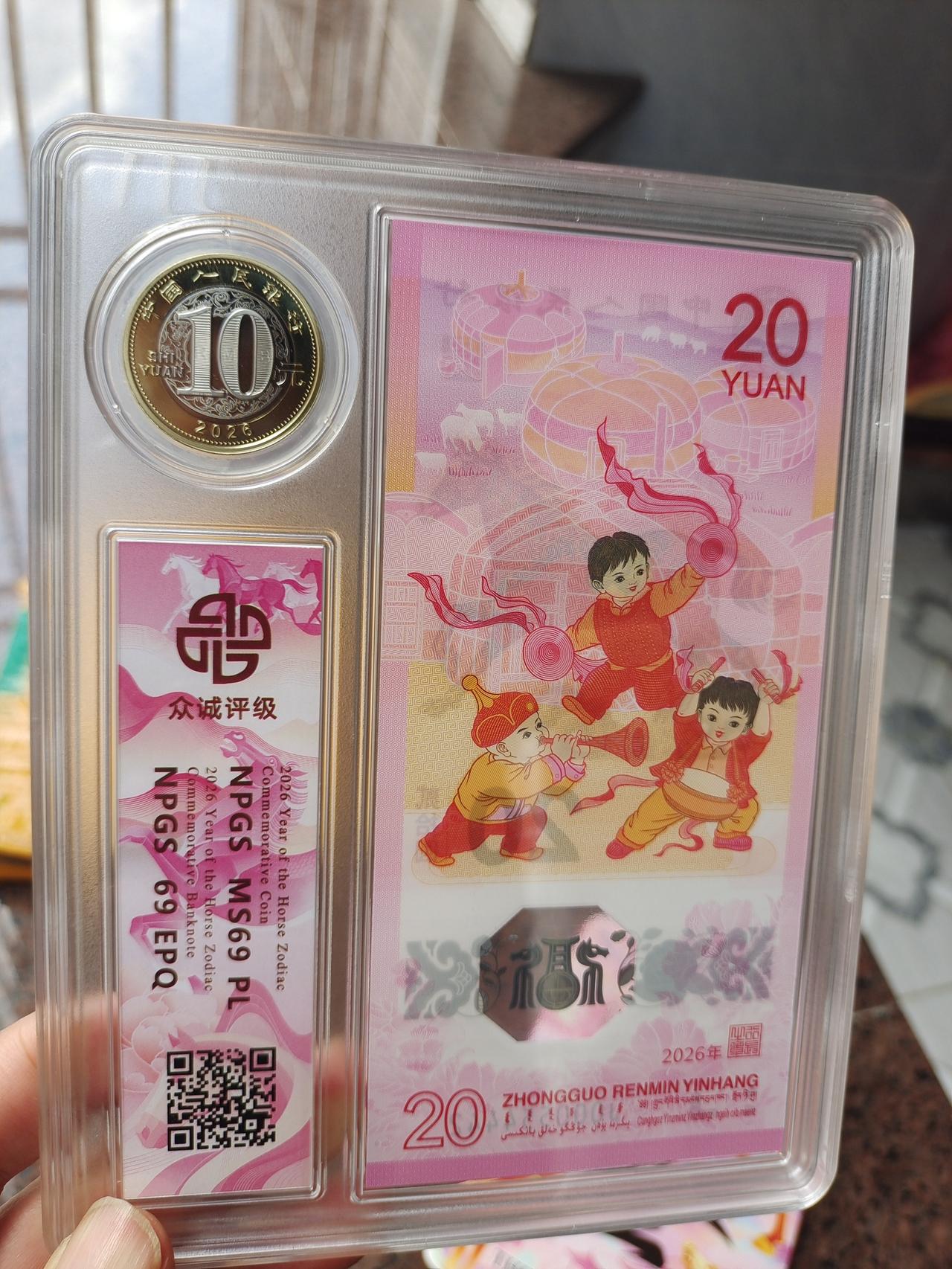 在刷抖音刷时,无意间被这套2026年马年贺岁纪念币钞套装吸引,果断下单。这套藏品包含一枚双色铜合金纪念币和一张面值贰拾圆的纪念钞,均为中国人民银行发行的法定货币。纪念钞正面以奔马为主景,融合传统吉祥纹饰。 号码为;开门大吉,小司令,双豹子,葫芦号,连对号。 我个人认为设计时应该在马背上加个元宝,寓意“马上有钱”。这样效果更好,就冲这寓意它的收藏价值也许会更高。
