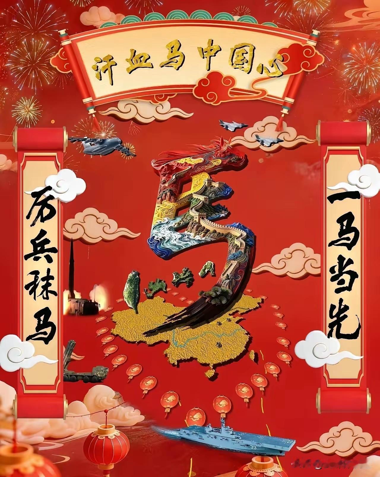 《汗血马 中国心》东部战区的春节海报: “英雄的人民子弟兵,无论何时何地,厉兵秣马、一马当先,坚定守护国家安宁、万家团圆。” 汗血马象征着中国人民解放军战力:千里奔袭、忠诚勇武——与军人“坚守战位”的职责形成共鸣。 汉武汗血马,寄意着 汉朝的大一统与汉朝的强盛!自公元 2000 年前汉朝的建立直到汉的的开疆拓土 励精图治 让中国进入了汉朝盛世。而国家的统一 是势在必行 也是历史的必然! 英雄的人民子弟兵,厉兵秣马,一马当先,保家卫国 护国安康 万家灯火,华灯升鸿。就在农历马年到来之际,保持强大军事护国力量,“全时待战 随时能战 战之必胜”!这就是中国人民解放军的战斗精神,一切为了人民为了国家。 而中国人民手上的强大武器,这护国安康的主要力量: 舷号 33 是中国人民解放军 075 两栖攻击舰! 远程箱火,已经立起! 火箭军导弹也随时处于“发射”状态! 运 -20 歼-20 战机 随时升空 护卫空域安全! 960 万平方公里全国人民普天同乐,过中国传统的春节。东部战区的全体军人向全国拜年,祝国家更强大 人民更幸福 国家更安全,台湾人民与大陆人民春节同乐,国家的统一使命 中国解放军记在心中! 今开的东部战区保持强大的护国力量的同时,全国各战区均是一样护卫 国家的安全! 在此也祝愿咱们的中国人民子弟兵们也在春节期间与国同享 与民同乐,快快乐乐的过上春节,也祝他们春节快乐 身健健 康,全国人民也感谢在一线战线上节日值班的人民子弟兵们!