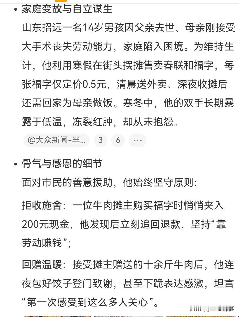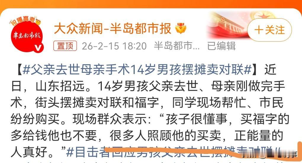 穷人的孩子早当家。近日山东招远,父亲去世,母亲手术,14岁男孩摆摊卖对联。 很多人都来买他的对联,有的多给钱,小伙子坚决不收,这个人品可以的。 有的人嫉妒他,说他的母亲装病。 于是他出示了父亲的火化证明以及母亲的医疗记录。 所以说那个质疑男孩的人真的是胡说八道。