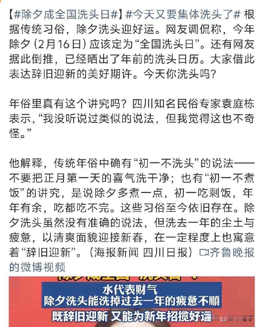 我们一家都打算今晚洗头了。传统年俗里,大年初一不能洗头,因为水象征财气,洗头会冲走新年的喜气与财运。所以大家都会赶在除夕这天洗去旧年的疲惫和晦气,清清爽爽迎新年。 这也渐渐形成了“除夕洗头迎财,初一守财不洗”的默契。尊重老习俗,愿新的一年顺顺利利,心想事成!