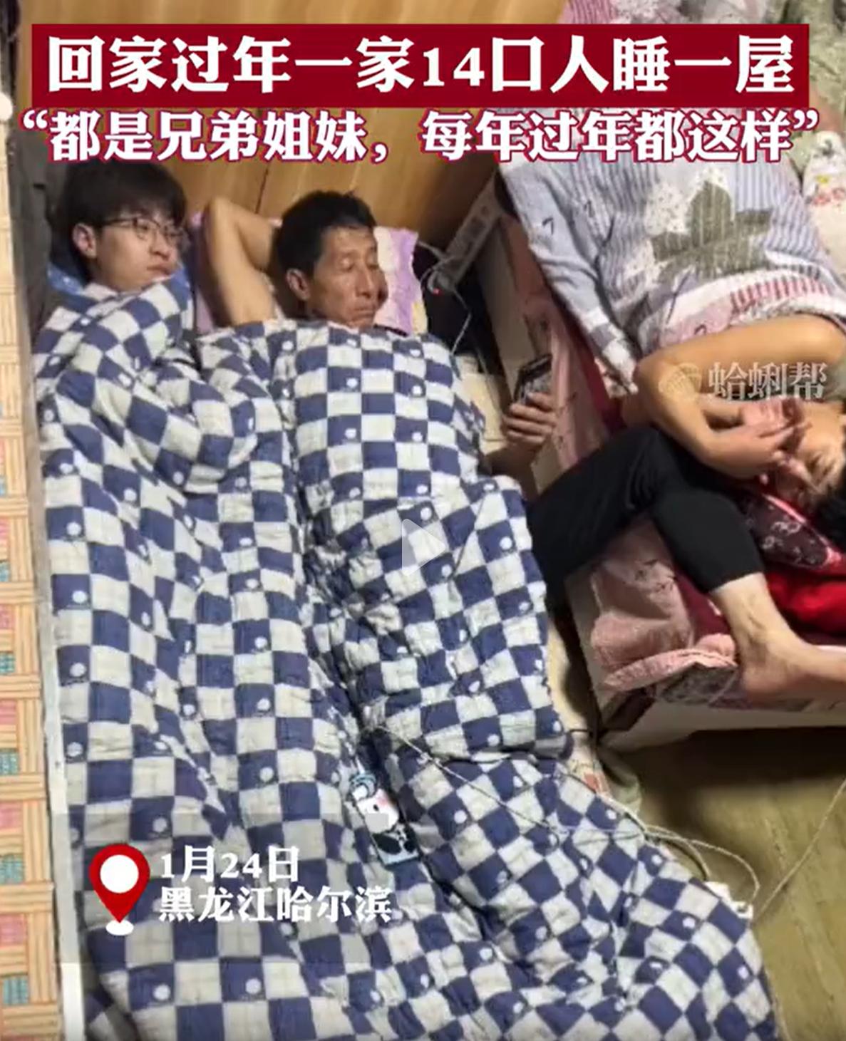 黑龙江,一女子晒出回家过年的生活,一家14口挤在一个不大的屋子里面睡觉,几乎连下