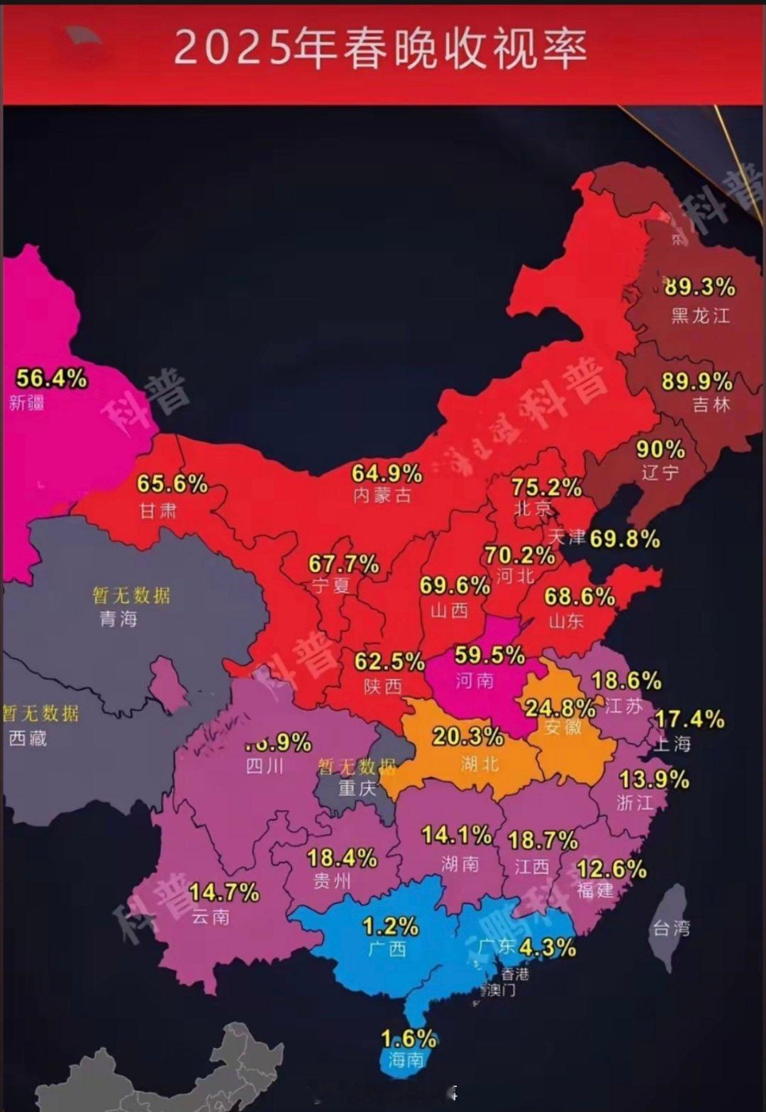 春晚节目单刚去搜了一下2025年春晚收视率地图。和我印象里一样,现在春晚是很多年了,都是北方收视率高一点。