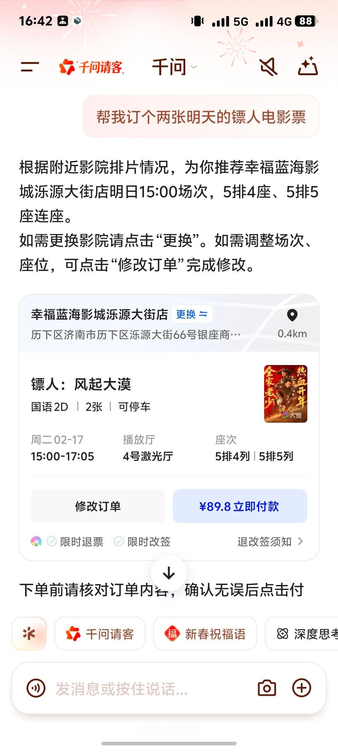 大年初一的电影票在千问上抢疯了千问新活动的请客卡居然可以用来买电影票?有卡的家人们记得用,能抵扣25块钱呢。直接对千问说“帮我订初几的xx电影票”就行了。可以提前订大年初一黄金档滴票啦明天(17日)是邀请新用户得请客卡的最后一天,可以给亲戚朋友推销一下得两张卡薅个羊毛还挺实用。