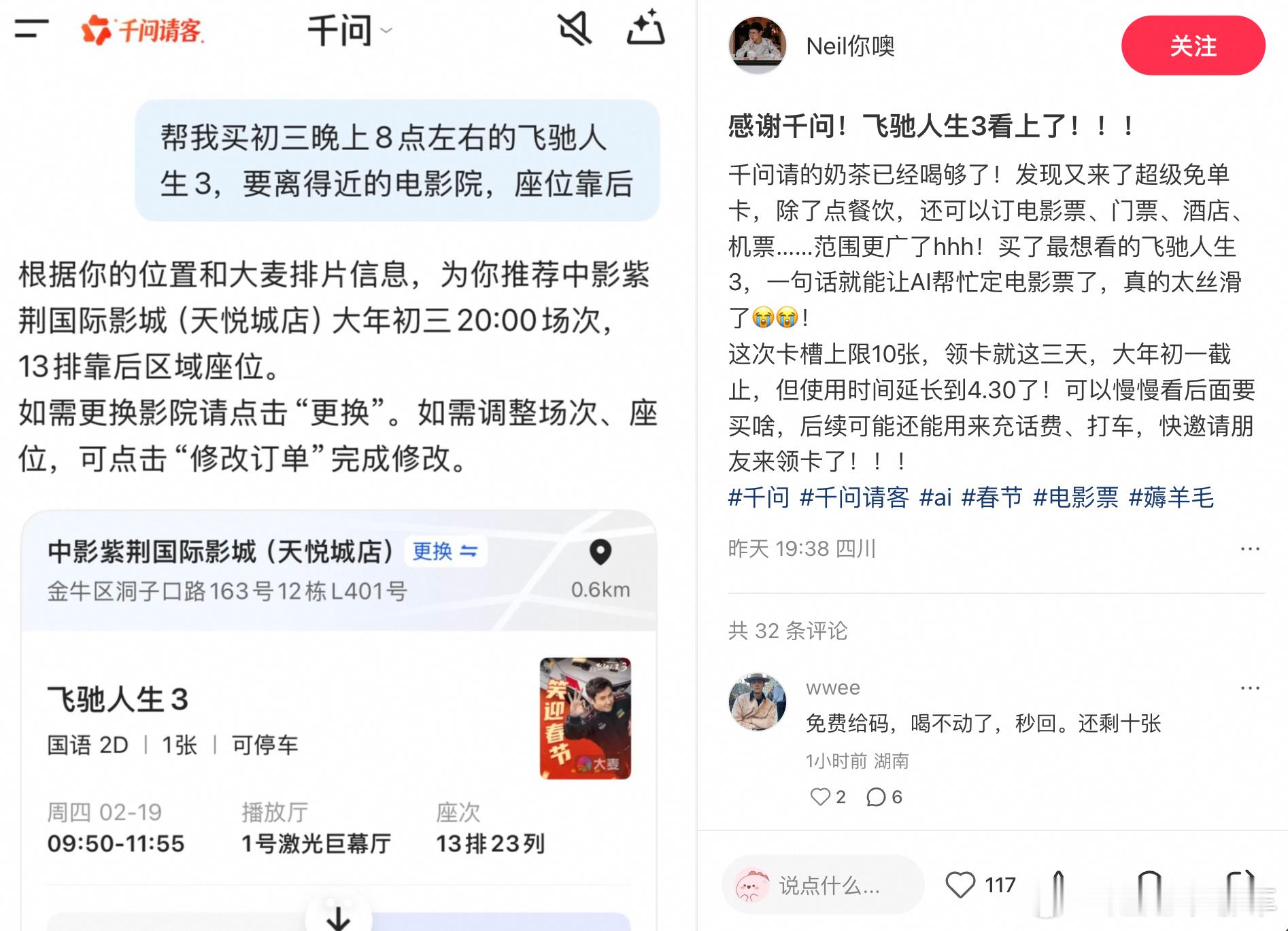 大年初一的电影票在千问上抢疯了 看到最近网友们全都在晒用千问买电影票的免单截图!看着大家美滋滋地晒出25元立减订单,用一张“超级请客卡”,直接把春节档大片《飞驰人生3》《惊蛰无声》的价格打下来,我这心里真是痒痒的。不得不说,现在的AI也太神了吧!语音买票十几秒搞定,选影院、挑座位一步到位,简直是为懒人量身定做的万能神器!感觉只有我想不到,没有它办不到~听说2月17日是领卡的截止日期,赶紧去薅最后一波羊毛!我一会也试试“帮我买电影票”去,咱大年初一也得看上优惠票!