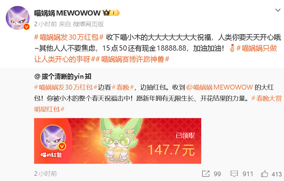 喵娲娲红包送完你的送你的全网最大方的猫出现了 谁还没被喵娲娲感动到!从微博之夜