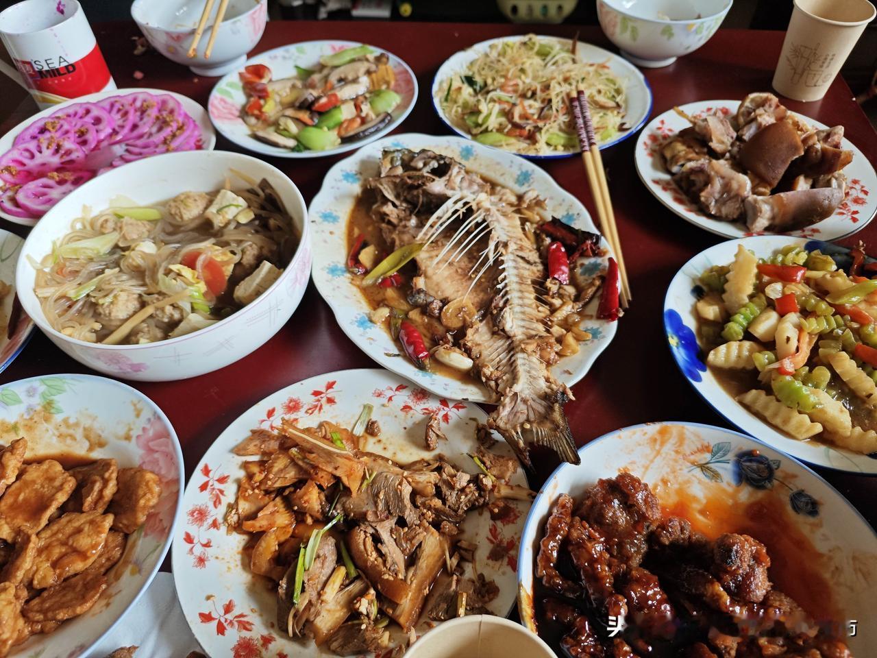 年年喊精简,年年都丰盛——我家年夜饭越做越丰盛! 年年都说年夜饭少做一点、再少一点,结果每年都越做越多,满满一桌子根本放不下,根本吃不完。 作为宁夏银川的传统汉族家庭,年夜饭的硬菜一样都不能少:东坡肘子、卤猪脚、猪耳朵、猪头肉,是每年雷打不动的主角,寓意富足圆满。再配上黄焖鸡、鲜鱼、牛羊肉,荤素搭配,热气腾腾。 本来计划的五菜一汤,不知不觉变成十五菜两汤,七个碟子八个碗摆得满满当当。嘴上说着吃不完,手上却丝毫停不下来,总觉得少一道菜,就会少了一份年的味道。 烟火气里藏着团圆幸福,满桌美味佳肴盛着心意。越是家常,越是珍贵,这就是我家最踏实、最温暖的年味。银川 遇见宁夏 全家人年夜饭 北方年夜饭