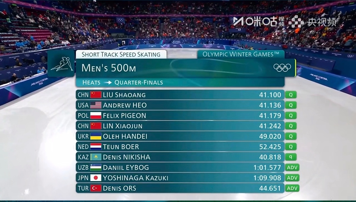米兰冬奥会短道速滑男子500米预赛,林孝埈41.242获得小组第二,顺利晋级1/4决赛。