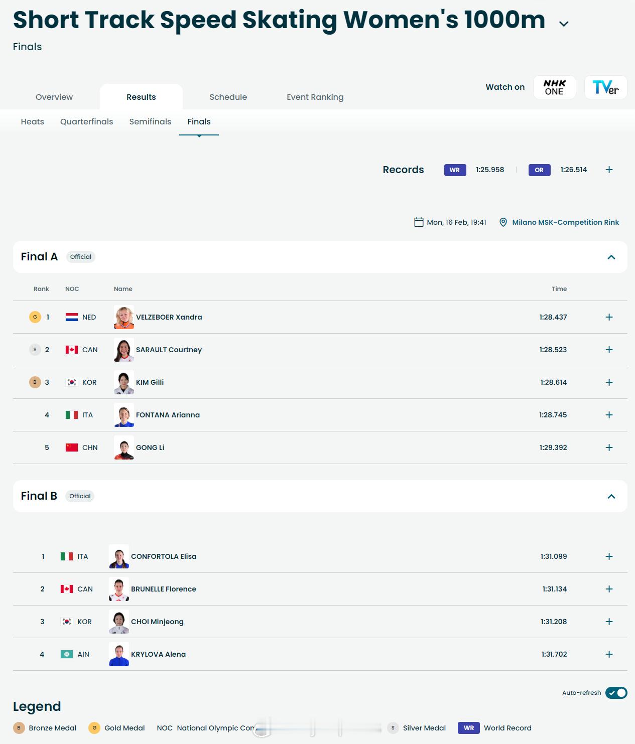 【冬奥短道女子1000米荷兰夺冠 公俐第五】冬奥短道速滑女子1000米短道速滑冬奥会 2月15日,冬奥会短道速滑女子1000米决赛结束,荷兰选手X-维尔泽波尔继500米后,又以1分28秒437夺得金牌,加拿大萨劳特和韩国金桔里分获银铜牌。意大利方塔纳和中国选手公俐分获四五名。