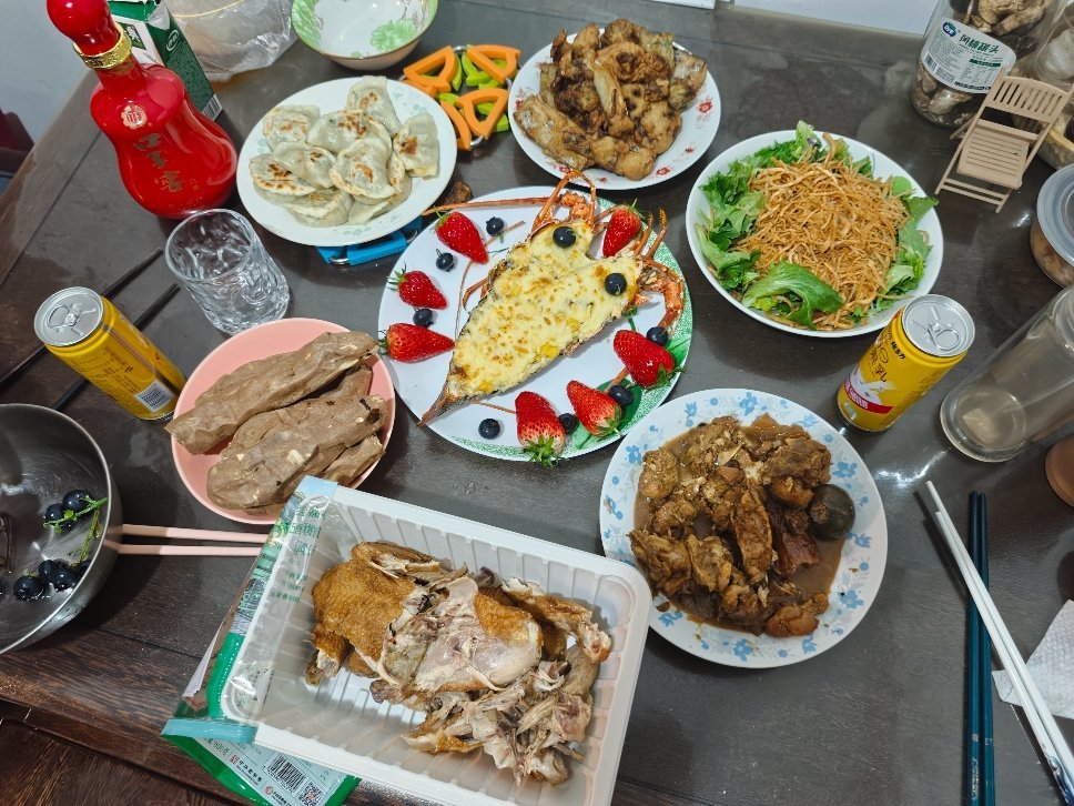 我做的中华锦绣龙虾最受欢迎,一家人站起来一起动筷,一起拉丝,还是很有意思的。