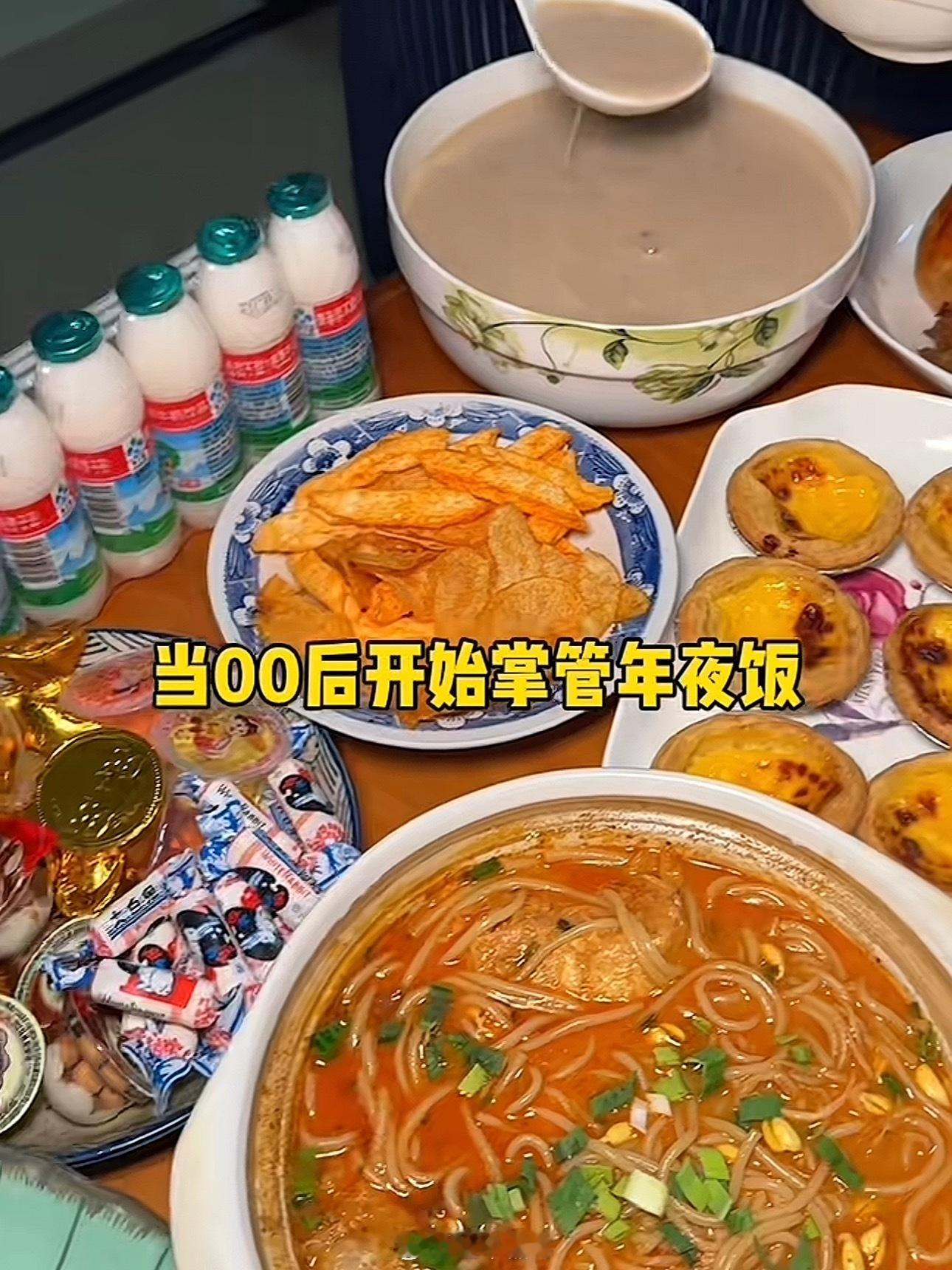 00后掌管除夕夜宵大权后泡面升咖了现在跟00后真比不了,我今天10个菜忙了一上午,00后可能1小时就完成了年夜饭。