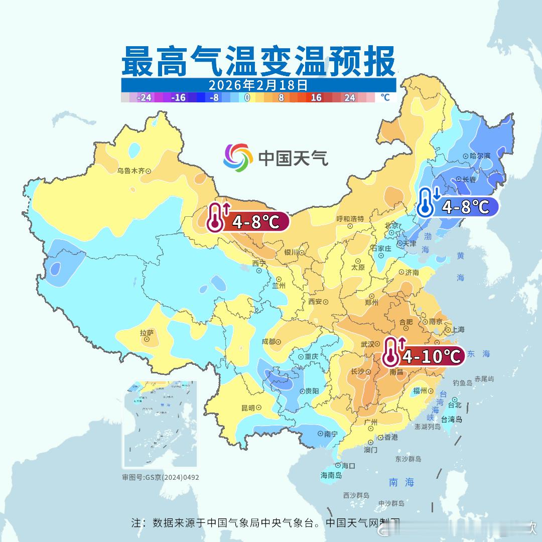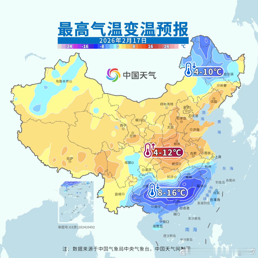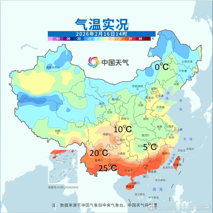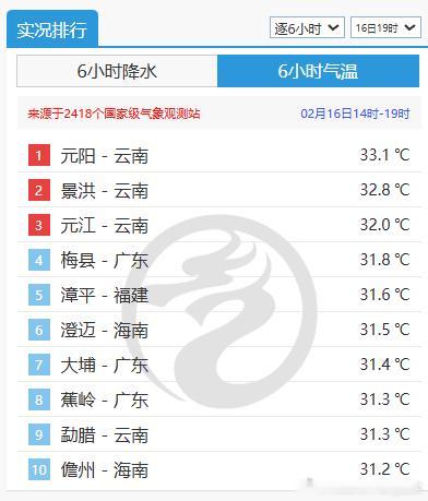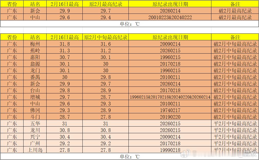 【气温震荡模式继续】今天寒潮影响江南等地的同时,华南气温依然处于高位,不少站点气温超30℃。广东有12站气温打破了2月中旬最高纪录,蕉岭连续2天破纪录;五华之前2天破纪录,今天平纪录;广州今天也追平2月中旬最高纪录。广东中山和新会,今天破2月最高纪录。新会把前天刚创的纪录,又拉高了0.2℃。
